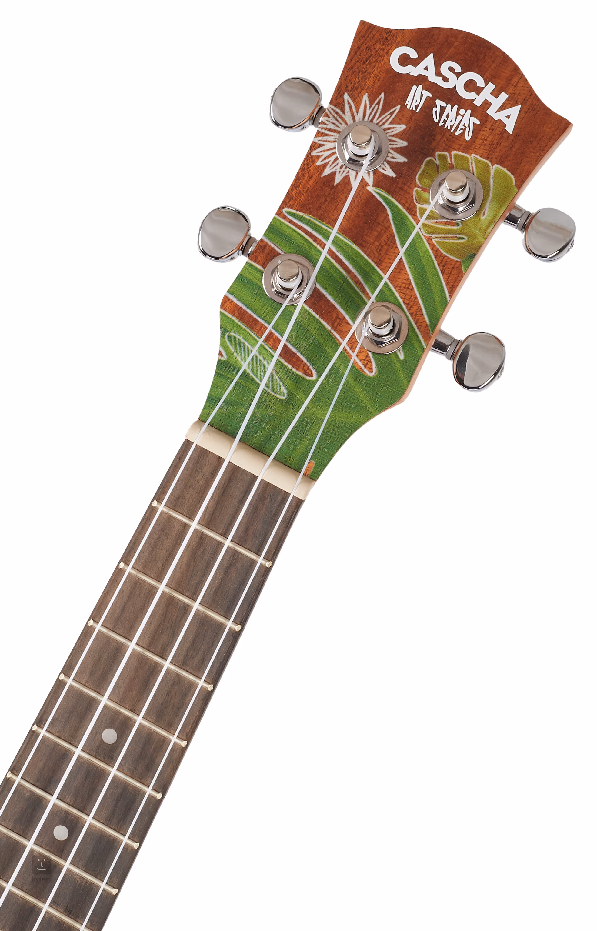 Die Sopran-Ukulele Leafy aus der Art Series von Cascha hat einen halbmassiven Korpus mit einer massiven Fichtendecke und einem Boden und Zargen aus laminiertem Mahagoni. Die Decke und der Kopf des Instruments sind mit grafischen Motiven verziert, die die Ukulelen der Art Series von den weniger auffälligen Modellen unterscheiden. Neben ihrem Aussehen besticht die Ukulele durch Aquila Nylgut-Saiten, die in präzisen Stimmmechaniken vom Gitarrentyp befestigt sind. Die Ukulele wird in einer gepolsterten Tasche (Polsterstärke 5 mm) zusammen mit drei Plektren geliefert. Die Marke Casha bietet eine breite Palette von Musikinstrumenten mit einem gemeinsamen Nenner: Erschwinglichkeit. Sie richtet sich damit gezielt an die Bedürfnisse von Musikern, die gerade erst anfangen, und bietet ihnen einen Komplettservice.