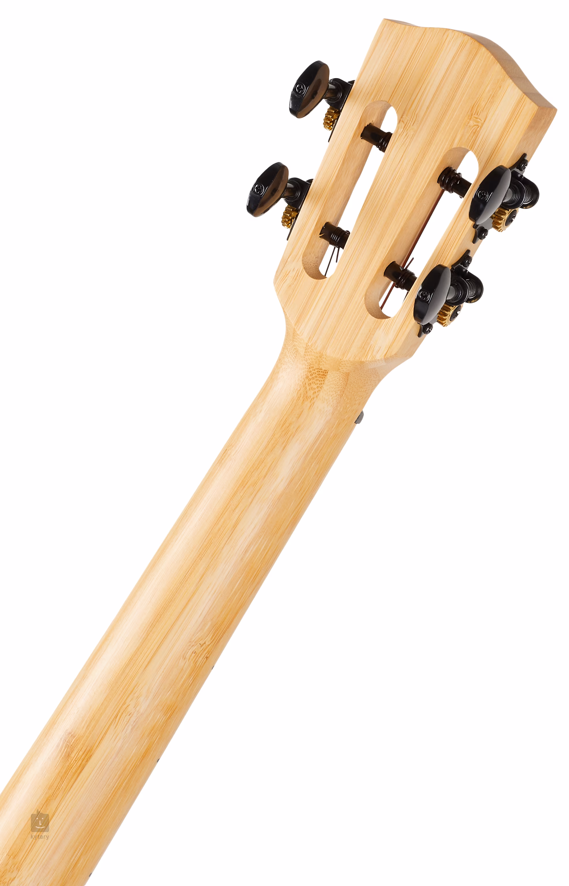 Die Bamboo Natural Tenor-Ukulele von Cascha ist ein vollmassives Instrument, das fast vollständig aus Bambus gefertigt ist. Die natürliche Maserung des Holzes verleiht der Ukulele zudem ein edles Aussehen. Neben dem massiven Bambuskorpus und -hals bieten das Bambusgriffbrett und der Bambusschuster eine Saitenbefestigung in klassischer offener Mechanik und ein mattes/satiniertes Finish.