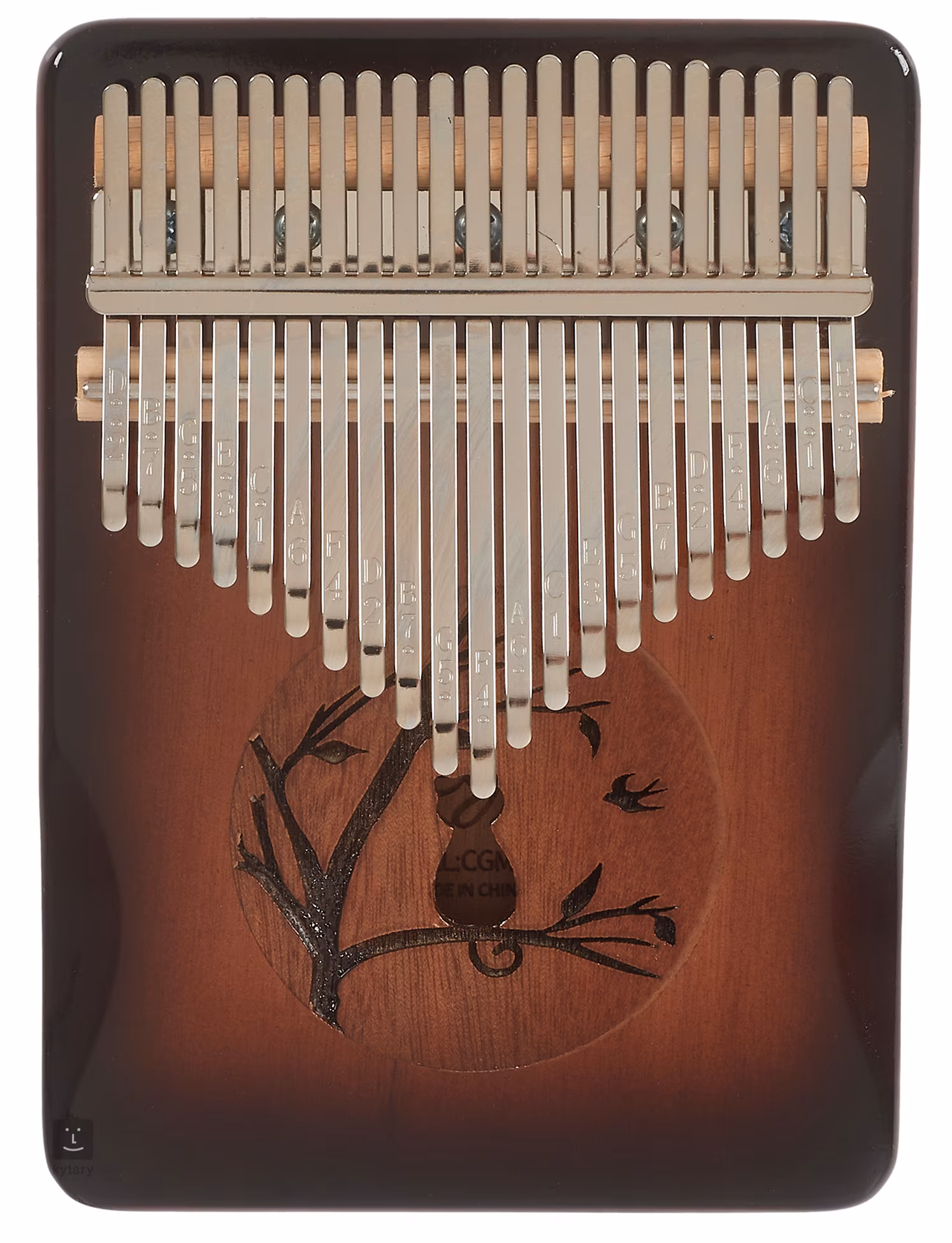Kalimba aus klangvollem Mahagoni, ausgestattet mit einundzwanzig Klappen aus Kohlenstoffstahl und gestimmt in C. Sie ist mit einer geschnitzten Katze um das Schallloch verziert. Eine Tragetasche ist im Lieferumfang enthalten, um das Instrument vor ungewollten Schäden zu schützen.