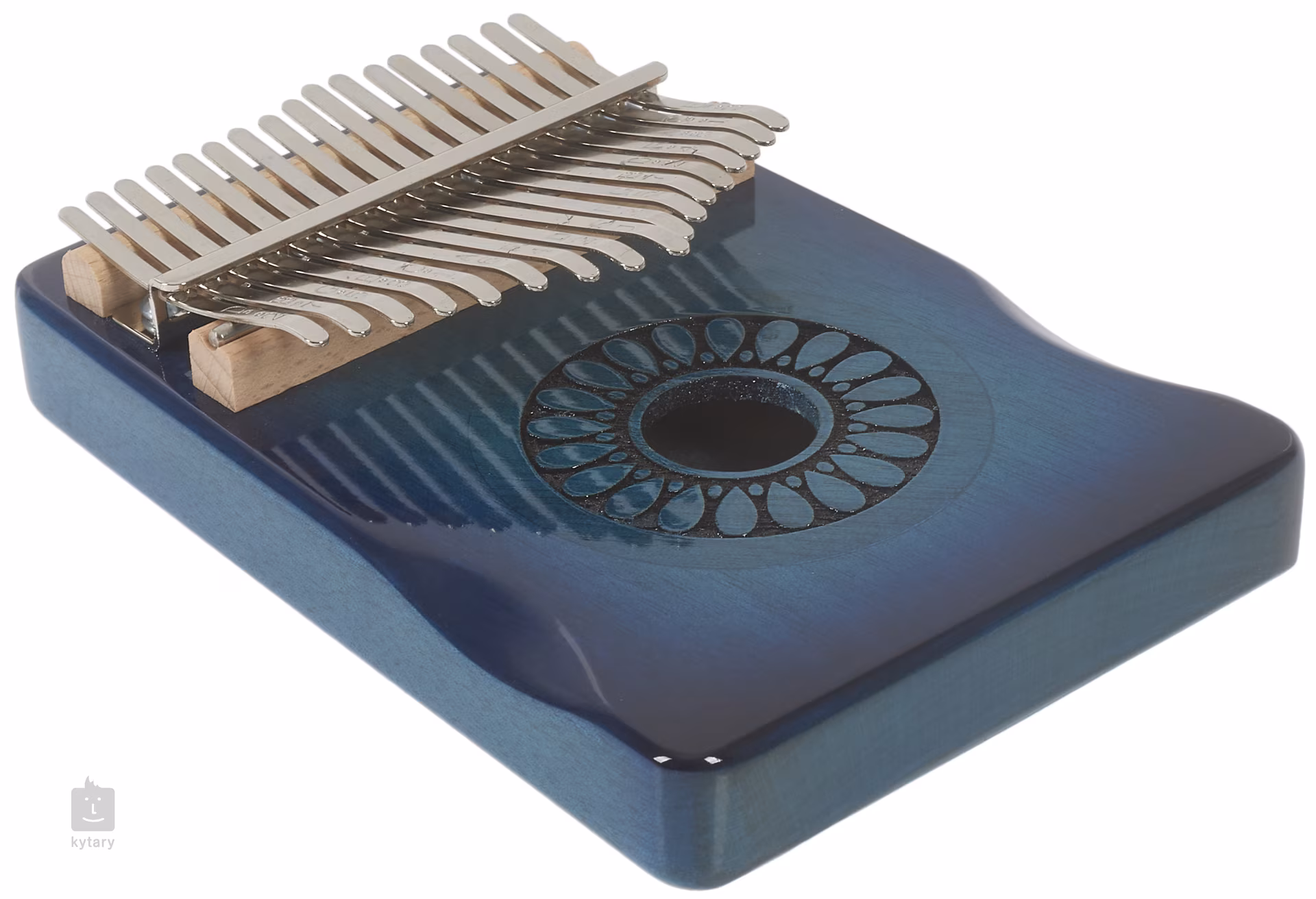 Kalimba aus klangvollem Mahagoni, ausgestattet mit siebzehn Klappen aus Kohlenstoffstahl und gestimmt in C. Sie ist mit einer Schnitzerei von Tropfen rund um das Schallloch verziert. Eine Tragetasche ist im Lieferumfang enthalten, um das Instrument vor ungewollten Schäden zu schützen.
