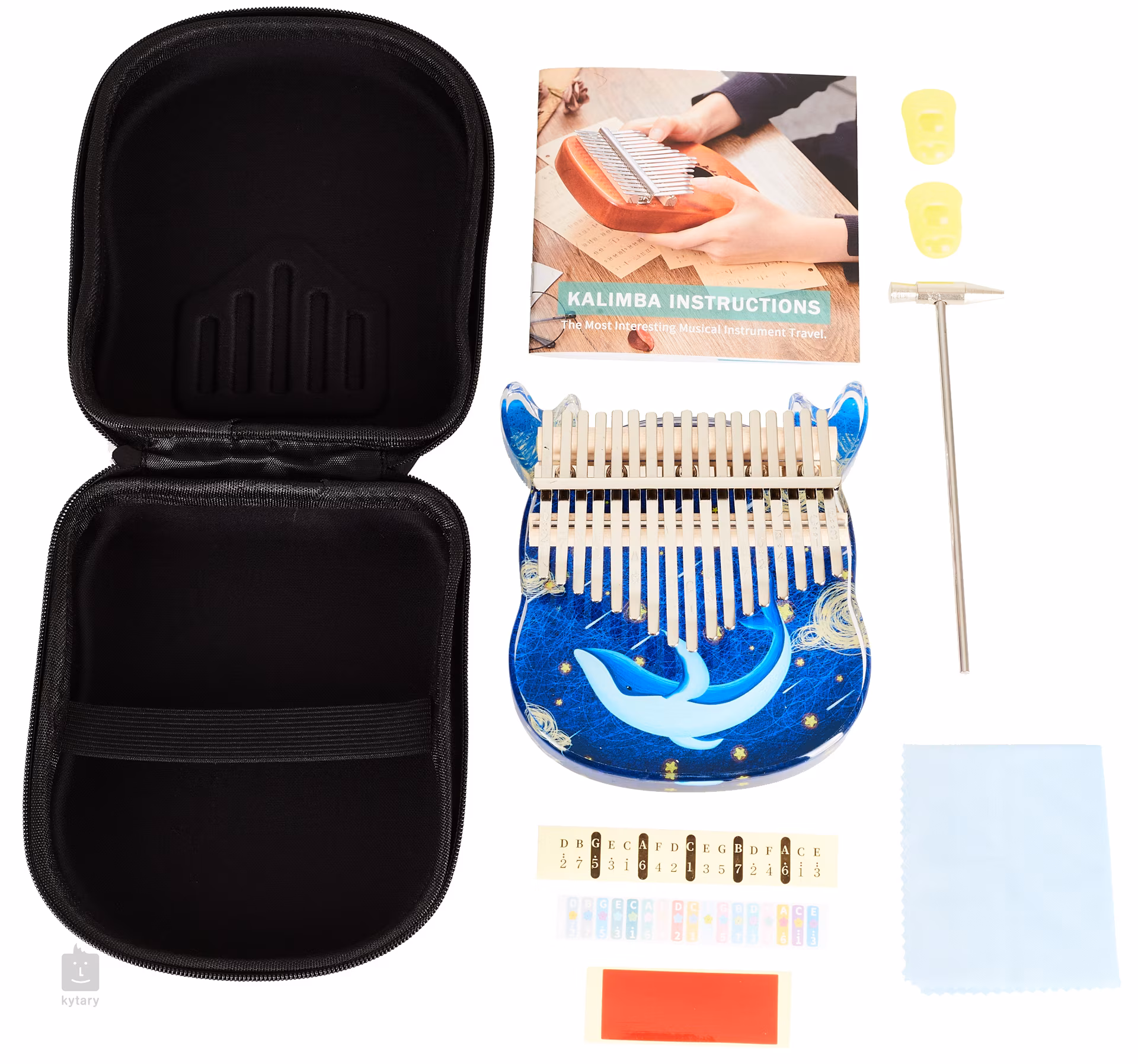 Im Lieferumfang enthalten sind außerdem ein Stimmhammer, ein Etui, Daumenschützer, ein Reinigungstuch, ein Anleitungsheft für Anfänger und Aufkleber, die die Orientierung auf den Tasten erleichtern.
