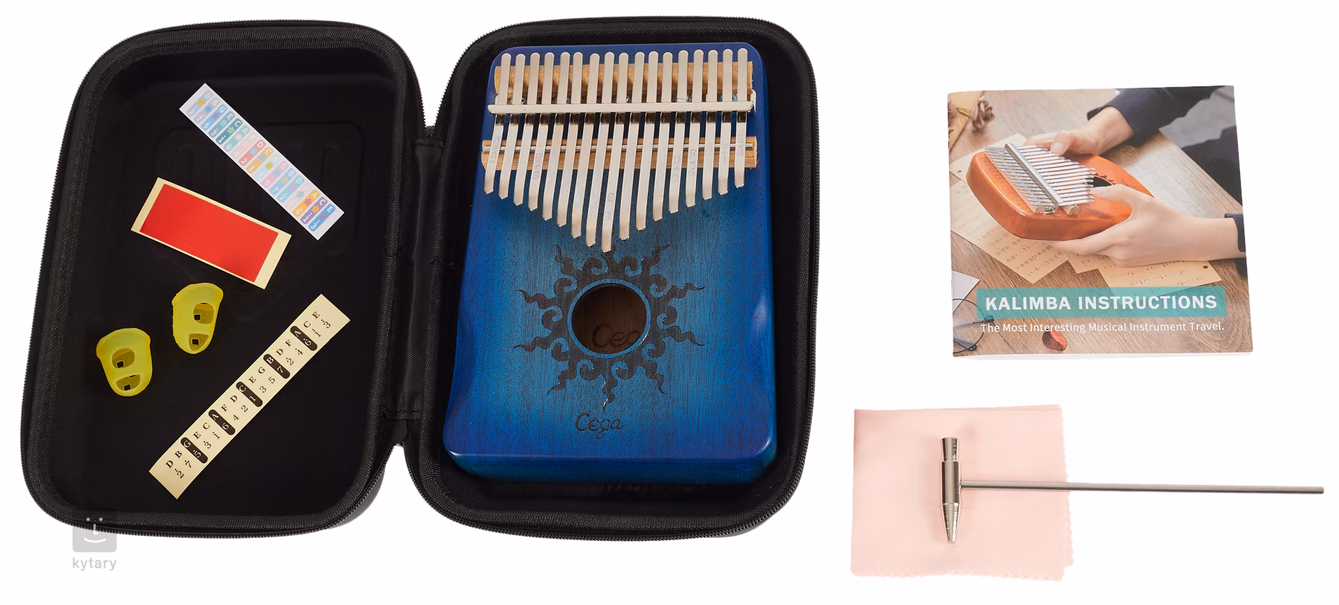 Zum Lieferumfang gehören neben dem Instrument selbst auch ein Handbuch, das eine anschauliche Einführung in das Instrument und die grundlegende Spieltechnik gibt, sowie zwei Ringe, ein Stimmhammer, ein Reinigungstuch, Tastaturaufkleber und ein Reiseetui.