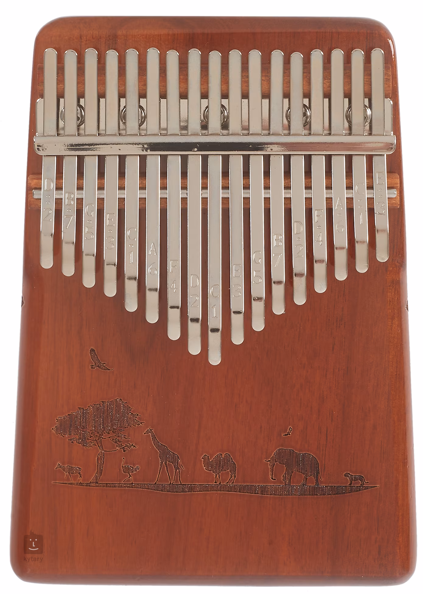Eine schöne Akazienkalimba mit siebzehn Klappen aus Kohlenstoffstahl und in C gestimmt. Es ist mit einer Schnitzerei eines laufenden Tieres verziert. Das Paket enthält eine Tragetasche, um das Instrument vor unerwünschten Schäden zu schützen.