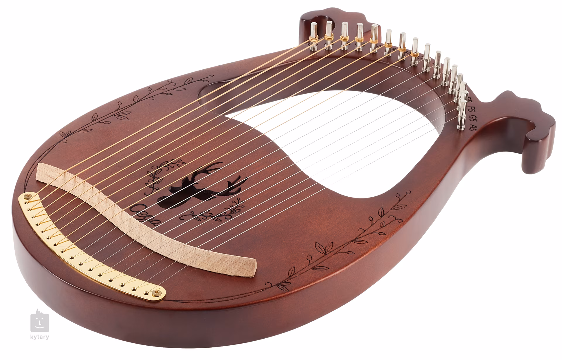 Die Lyra LH16C-T ist kaffeefarben, hat sechzehn Saiten und ist mit einer Schnitzerei um das Schallloch in Form eines Hirsches verziert.