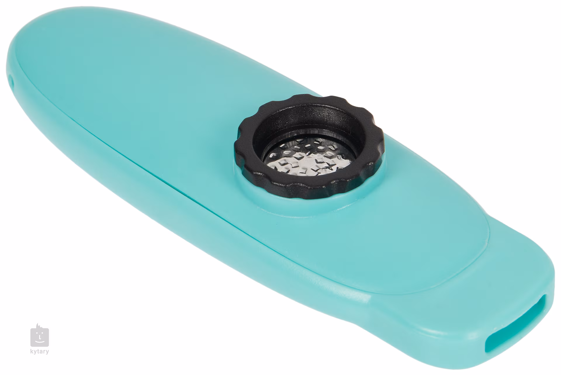Klassisches Kunststoff-Kazoo. Durch Drehen des Deckels können Sie die Spannung der Membran einstellen und die Klangreaktion des Kazoos verändern.