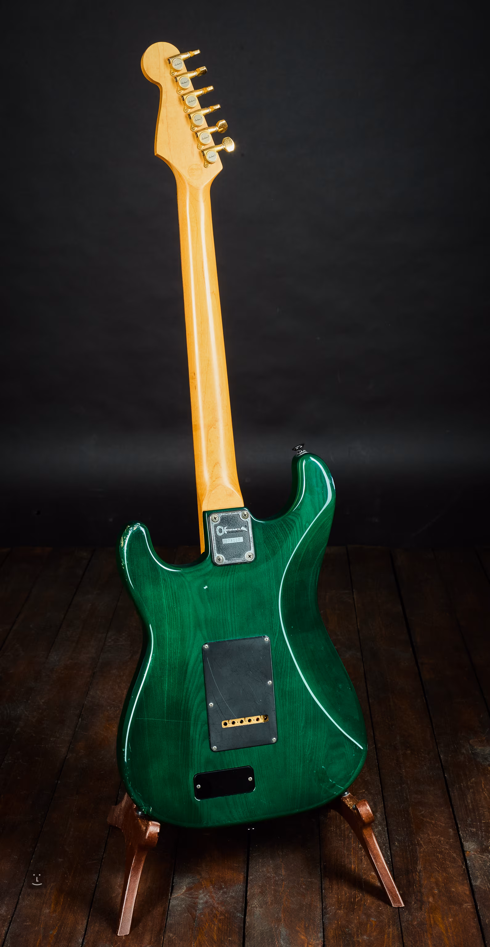In der Kombination aus transparentem Grün und goldener Hardware ist dieses Instrument vergleichsweise selten.