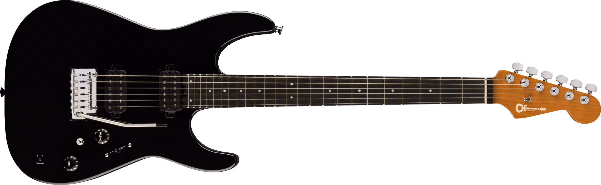 Die Pro-Mod Dinky PM DK24 HH 2PT EB Black E-Gitarre von Charvel hat einen Dinky/Superstrat Korpus.