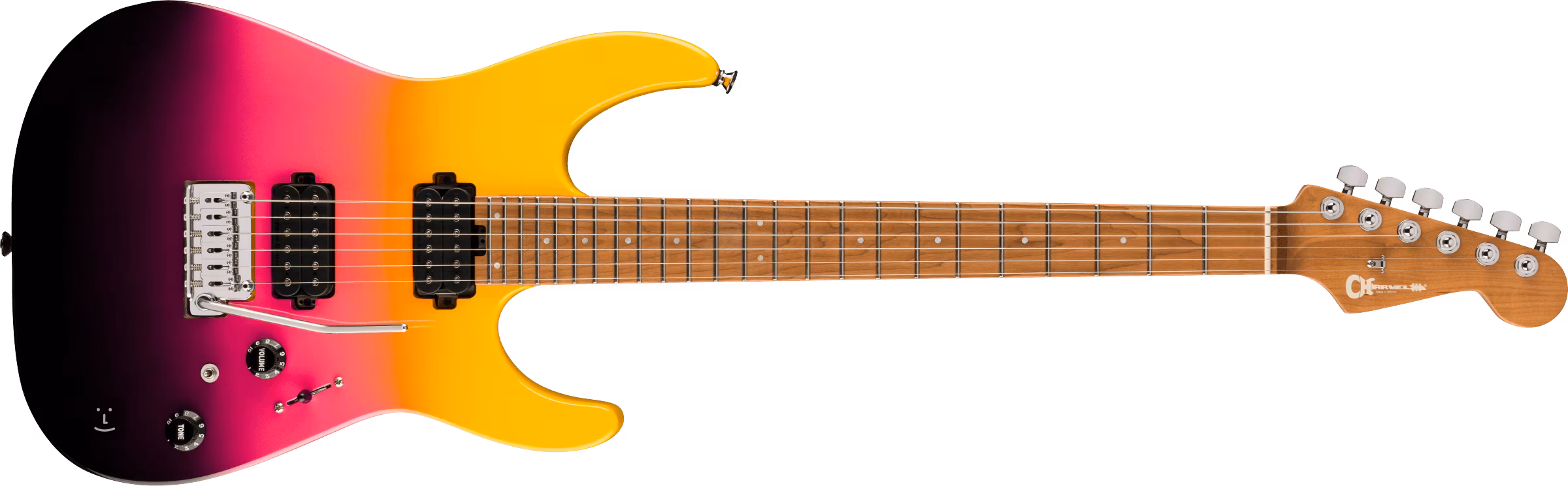 Charvel's Pro-Mod Dinky PM DK24 HH 2PT CM Malibu Sunset E-Gitarre verfügt über ein Dinky/Superstrat Korpus Design.