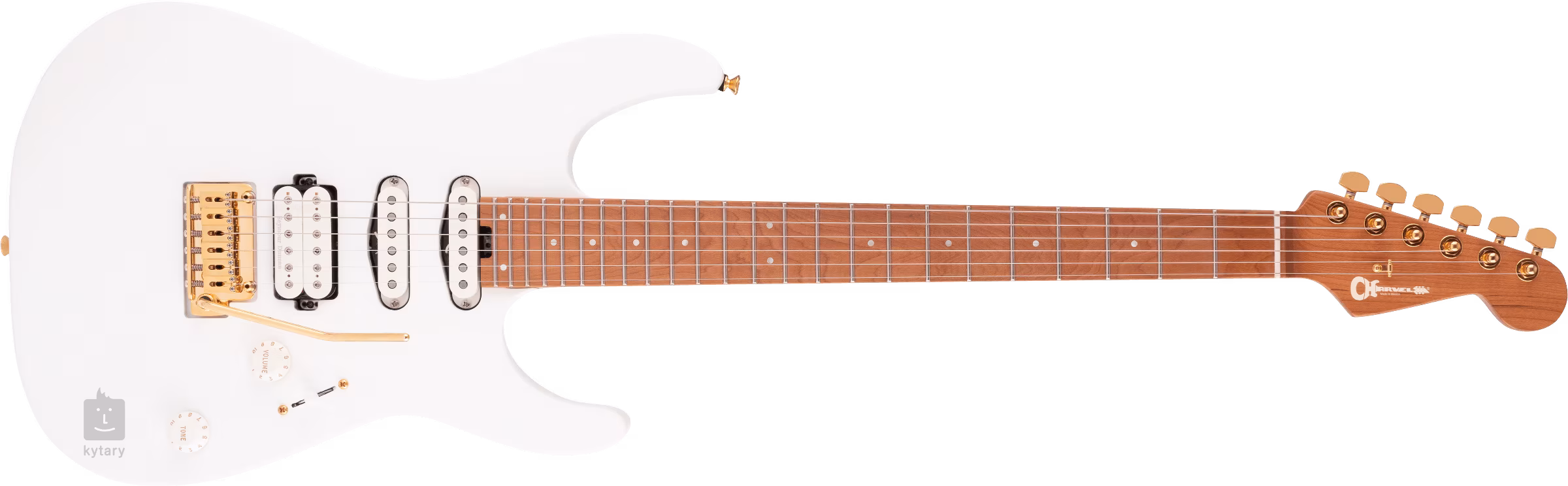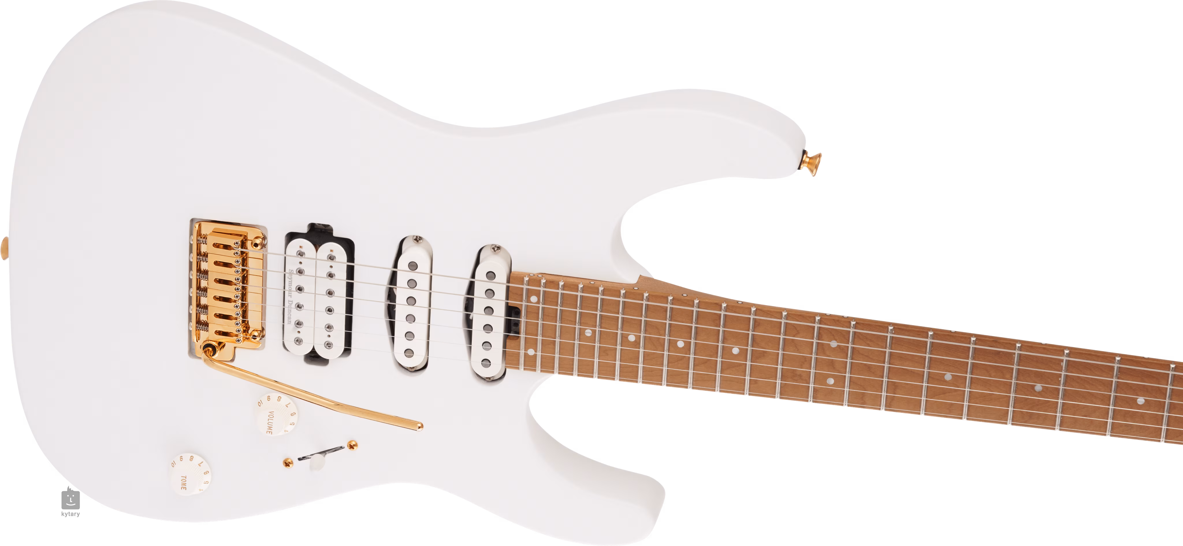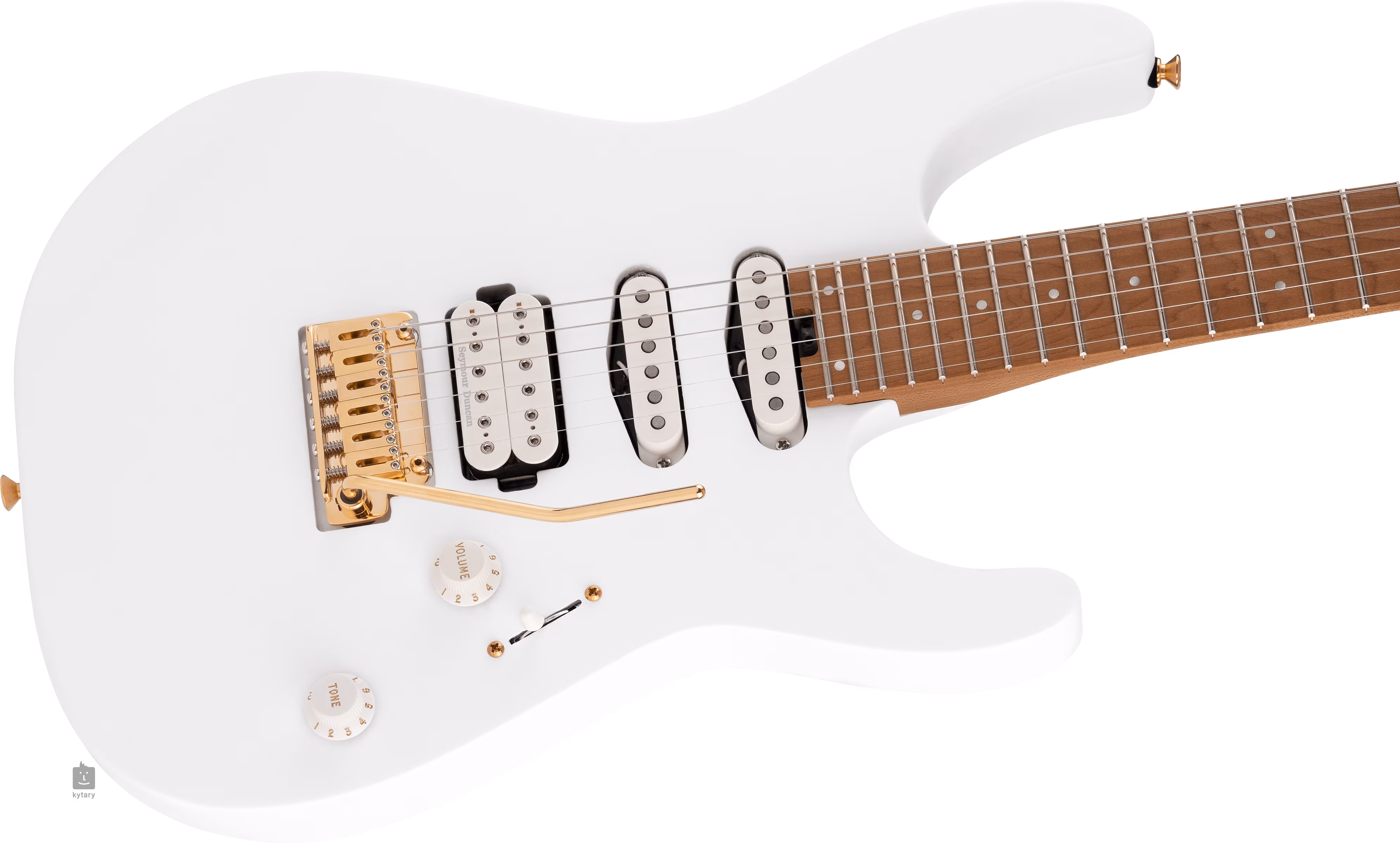 Die Pro-Mod DK24 HSS 2PT CM Snow White E-Gitarre von Charvel hat einen Dinky/Superstrat Korpus.