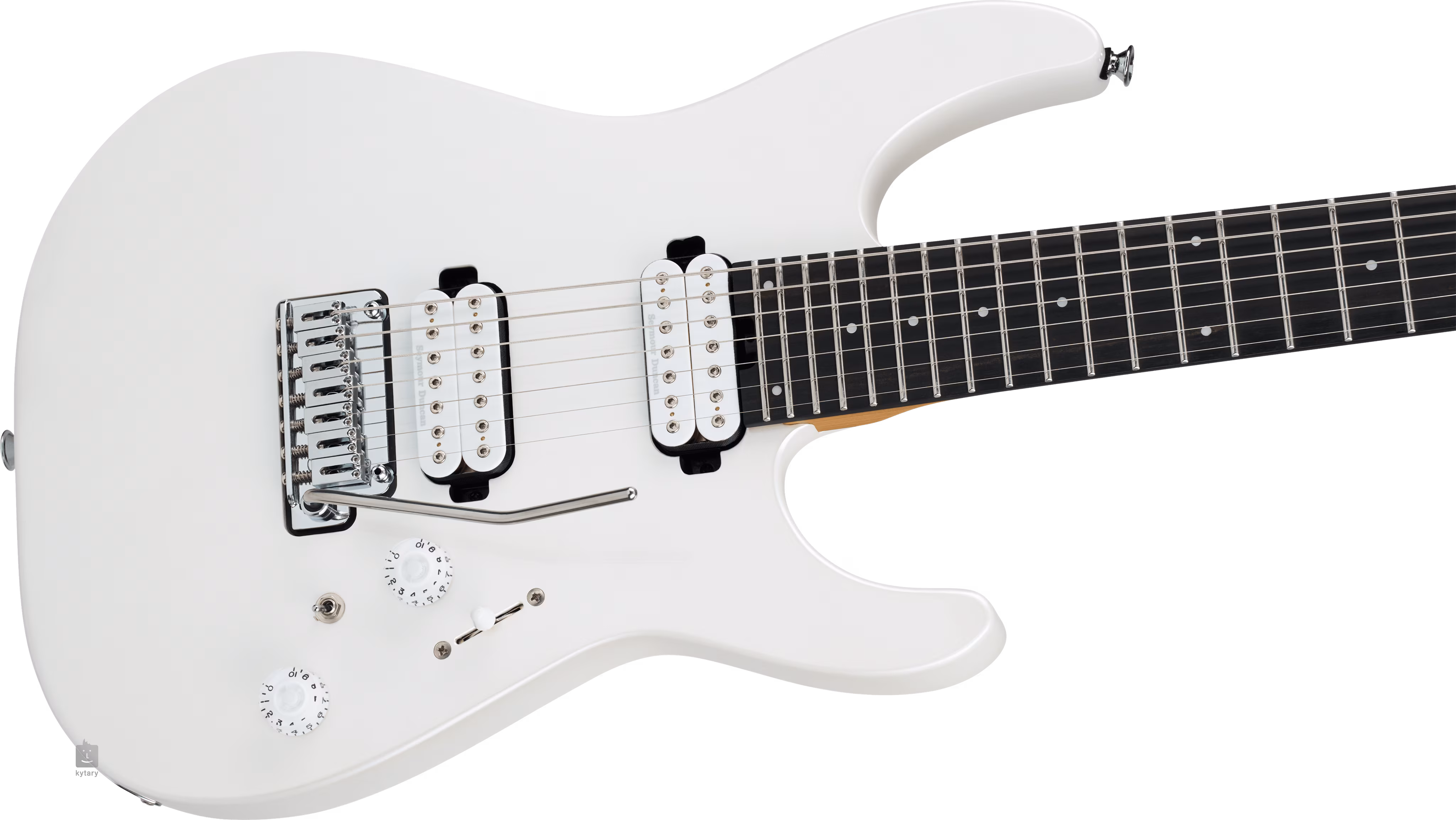 Die elektrische 7-saitige Gitarre Pro-Mod Plus DK24-7 HH 2PT EB EBY Celestial Silk aus der limitierten Auflage der Marke Charvel bietet ein Dinky/Superstrat-Design mit einem am Korpus verschraubten Hals und einer Reihe von Premium-Elementen.