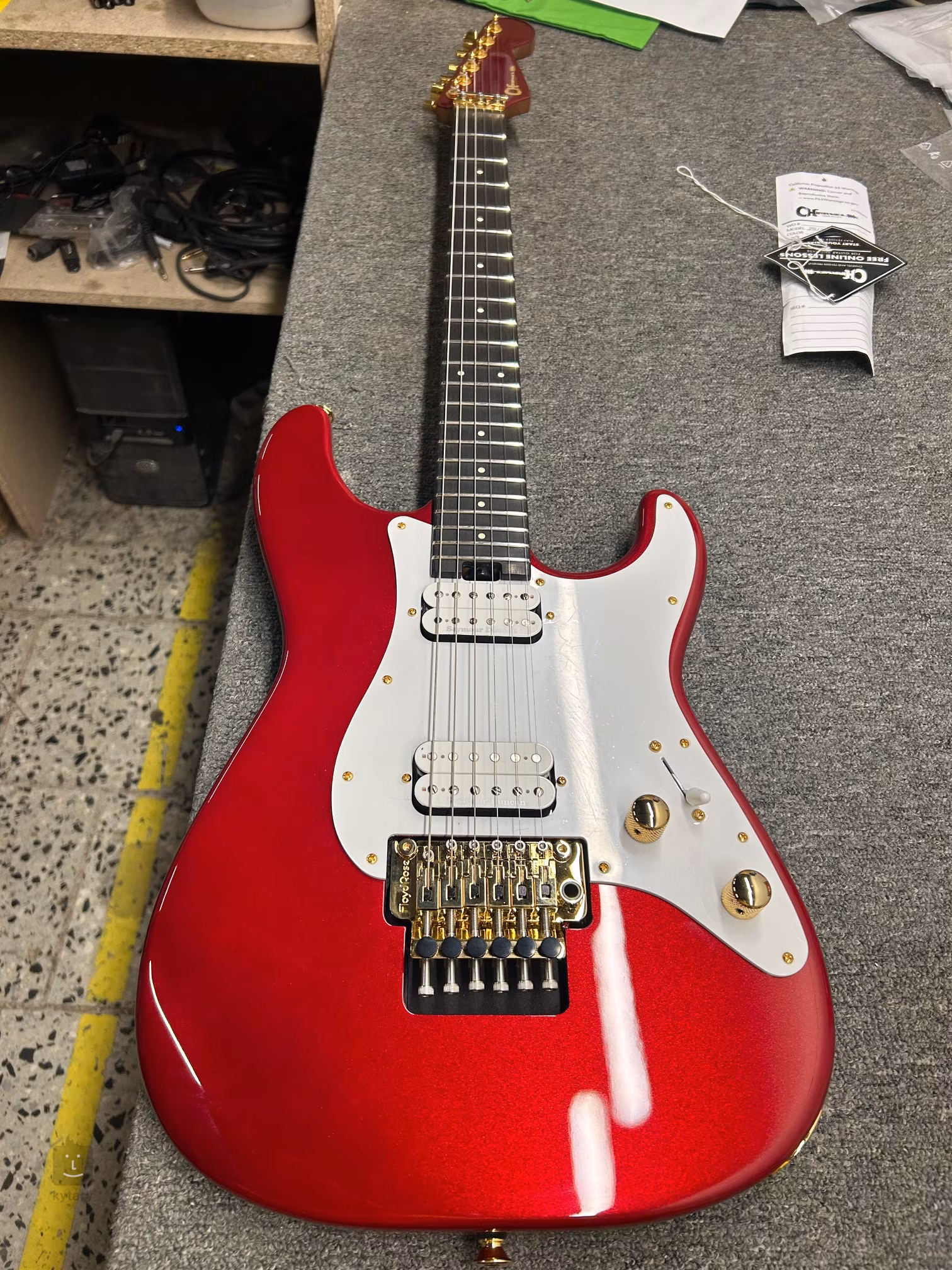 Die Saiten sind in die Druckguss-Laufwerke und das Floyd Rose-Tremolo der 1500er-Serie eingespannt, mit dem Sie Ihrem Spiel beeindruckende Klangeffekte hinzufügen können. Verriegelungen am Nullbund sorgen dafür, dass die Gitarre auch bei häufiger Betätigung des Tremolohebels gestimmt bleibt. Die stilvolle Verarbeitung wird durch goldene Hardware und ein Schlagbrett in der spezifischen Form der Charvel "So-Cal"-Gitarren akzentuiert.