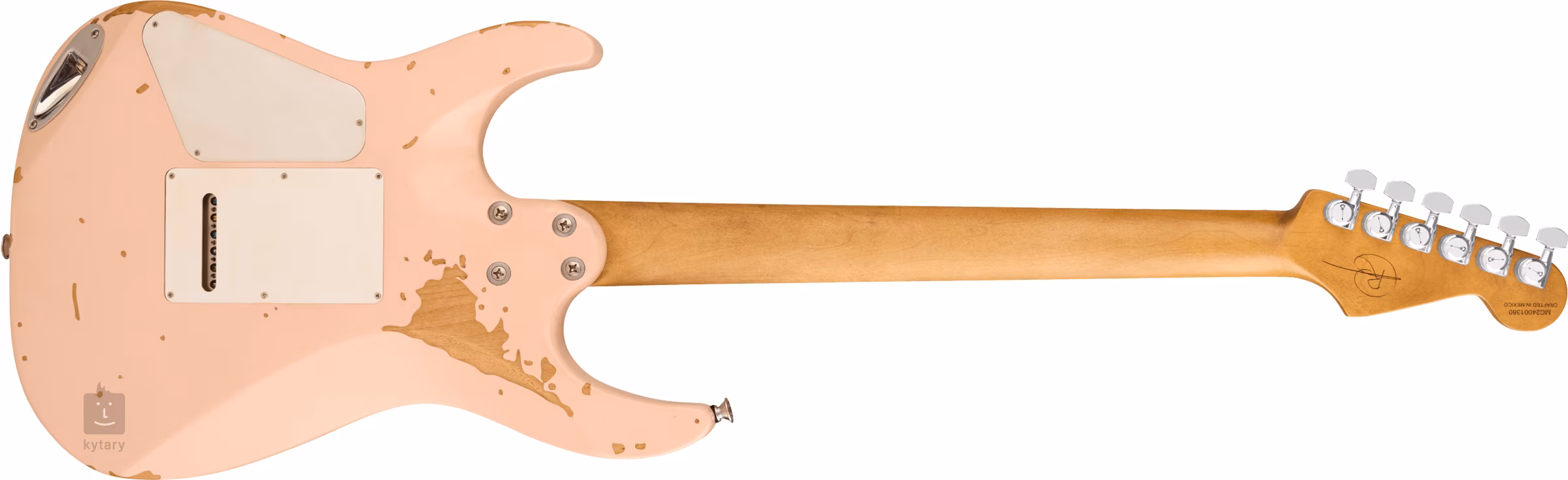 Der Erle-Korpus der Gitarre ist mit einer Nitrozellulose-Lackierung und dem Farbschema Worn Shell Pink mit markanten Faux-Patina-Elementen verziert. Der schnelle Ahornhals ist mit einem Graphit-Bracing verstärkt, und das Ahorn-Griffbrett ist mit vierundzwanzig Jumbo-Bünden ausgestattet. Ein definitives Plus für schnelle Spieler ist der abgesenkte Halsfuß, der konturierte untere Korpus-Cutaway und der Compound-Griffbrettradius (12-16 Zoll), der sowohl komfortables Riffing am Nullbund als auch bequemes ultraschnelles Shredden in höheren Lagen ermöglicht. Die Orientierung, auch in der Dämmerung, wird durch Leuchtpunkte an der Seite erleichtert.