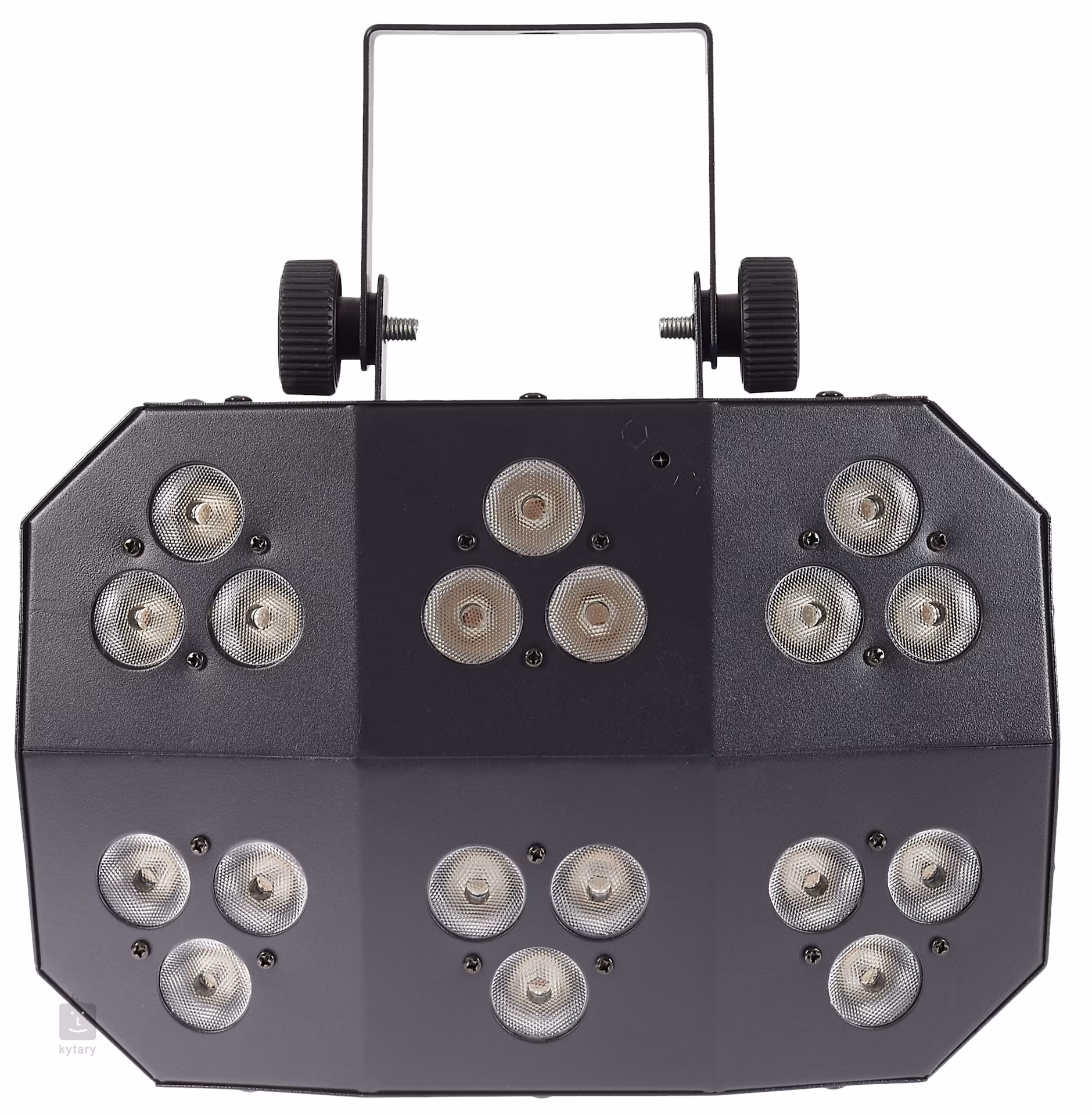 Seine Lichtquelle besteht aus achtzehn RGB + UV (4in1) LEDs, die Ihnen eine Fülle von Farbmischungen und Anpassungsmöglichkeiten bieten. Außerdem ist ein Strobe-Effekt mit einer einstellbaren Blitzfrequenz von 0 bis 25 Hz enthalten. Der Abstrahlwinkel der Leuchte beträgt 40°, ideal für diffuses Wash-Lighting.