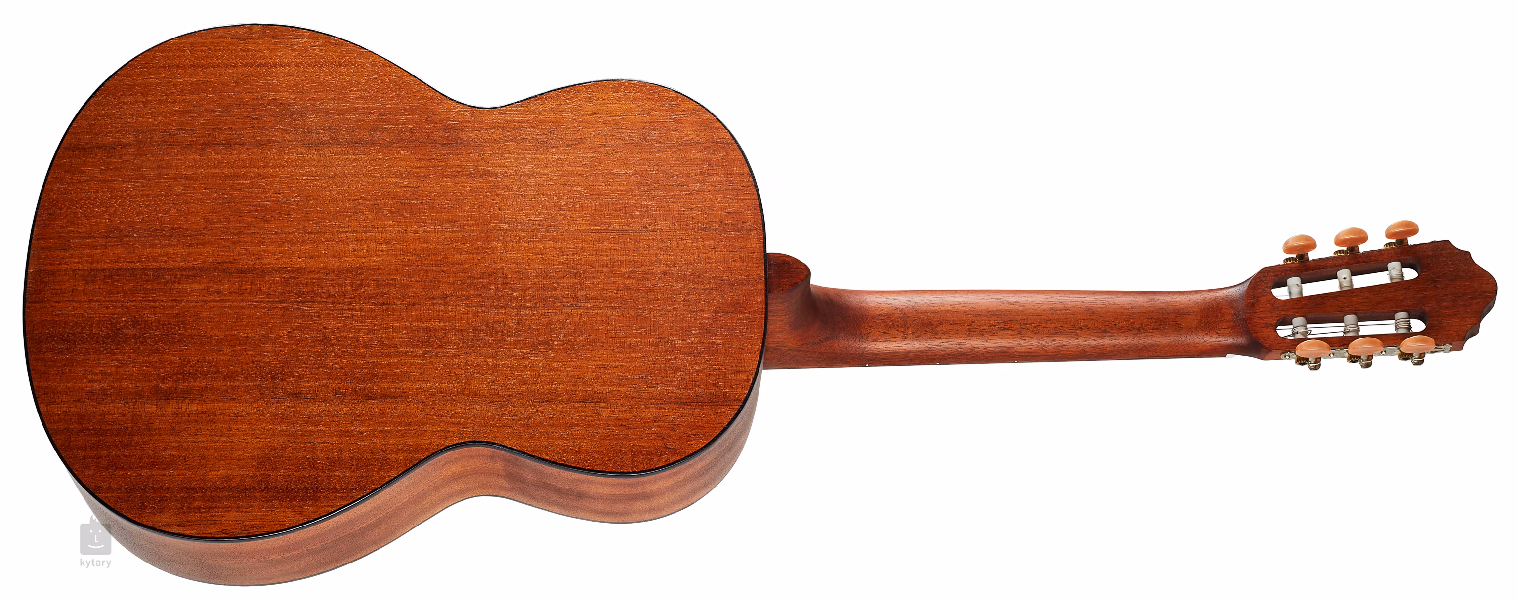 Der Resonanzboden besteht aus Fichtenholz, während Zargen und Boden aus Mahagoni gefertigt sind - eine bewährte Kombination. Der Hals ist ebenfalls aus Mahagoni gefertigt, und für das Griffbrett wurde Palisander verwendet, der auch für die Kopfplatte verwendet wird. Der Nullbund hat eine Breite von 52 mm, die Menusur entspricht 650 mm.