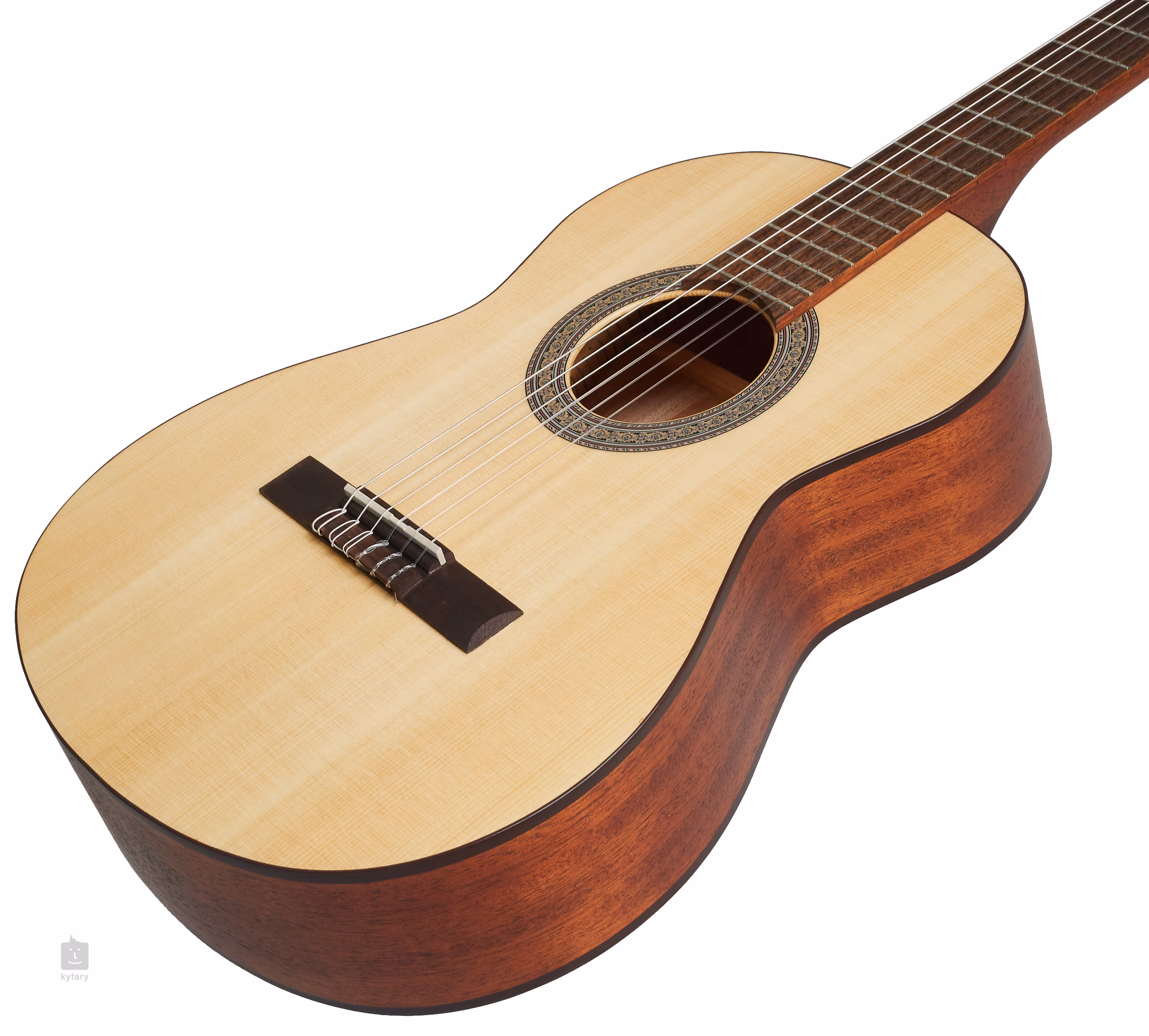 Die Cort AC-200 3/4 ist eine Kinder-Klassikgitarre in 3/4-Größe mit einer halbmassiven Konstruktion, die alle bewährten Praktiken wie die "Fächer"-Rippung, das am häufigsten verwendete Muster bei Klassikgitarren, verwendet. Der Korpus der Gitarre besteht aus massiver Fichte und der Boden und die Zargen sind aus Mahagoni gefertigt. Ein Merbau-Griffbrett mit 20 Bünden ist auf den ebenfalls aus Mahagoni gefertigten Hals geklebt. Auch das Design der Stimmmechaniken und die Zierrosette stehen in der Tradition.
