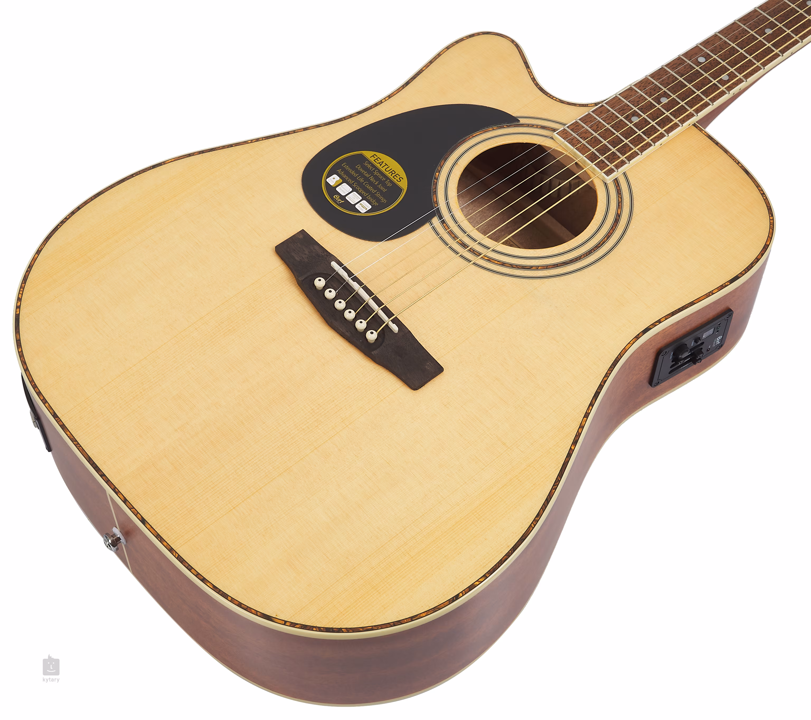 Die Cort AD880CE ist eine elektroakustische Gitarre vom Typ Dreadnought. Seine Frontplatte ist aus Fichtenholz, Boden und Zargen aus Mahagoni. Der Mahagoni-Hals wird durch ein Merbau-Griffbrett mit 20 Bünden ergänzt, und die Positionspunkte erleichtern die Navigation. Der untere Ausschnitt des Korpus bietet eine gute Anpassung auch an die höheren Lagen des Griffbretts.