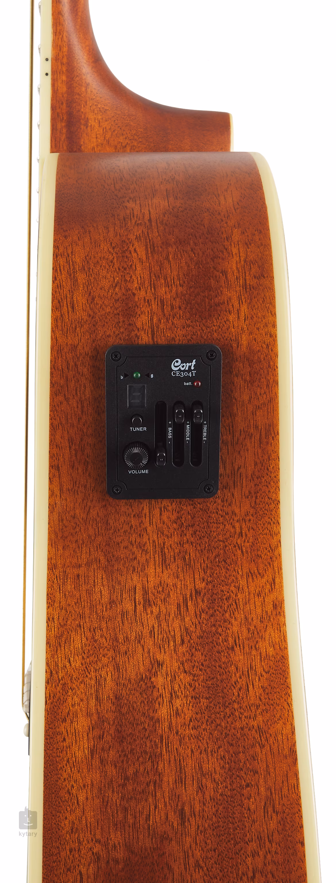 Für die Tonabnahme sorgt der Cort CE304T Vorverstärker mit Dreiband-EQ, Lautstärkeregler und eingebautem Stimmgerät.