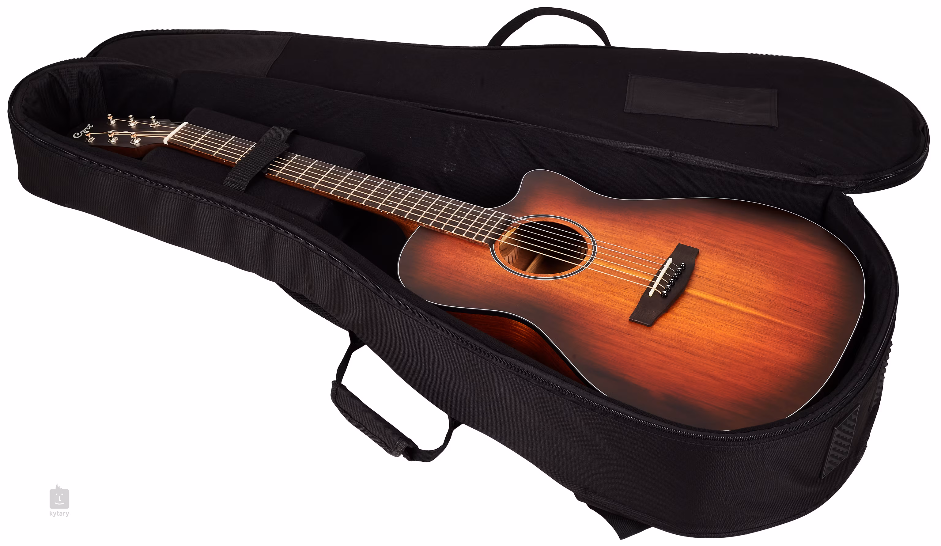 Einfache Voicing-Optionen bietet die Fishman Sonitone-Elektronik mit einem Sonicore-Subcoil-Tonabnehmer und Lautstärke- und Klangreglern, die sich im Schallloch des Instruments befinden. Die Gitarre wird in einem hochwertigen Koffer (Cort Deluxe Soft-Side Case) geliefert, der die besten Eigenschaften von Koffern mit der Praktikabilität von gepolsterten Gig-Bags kombiniert.