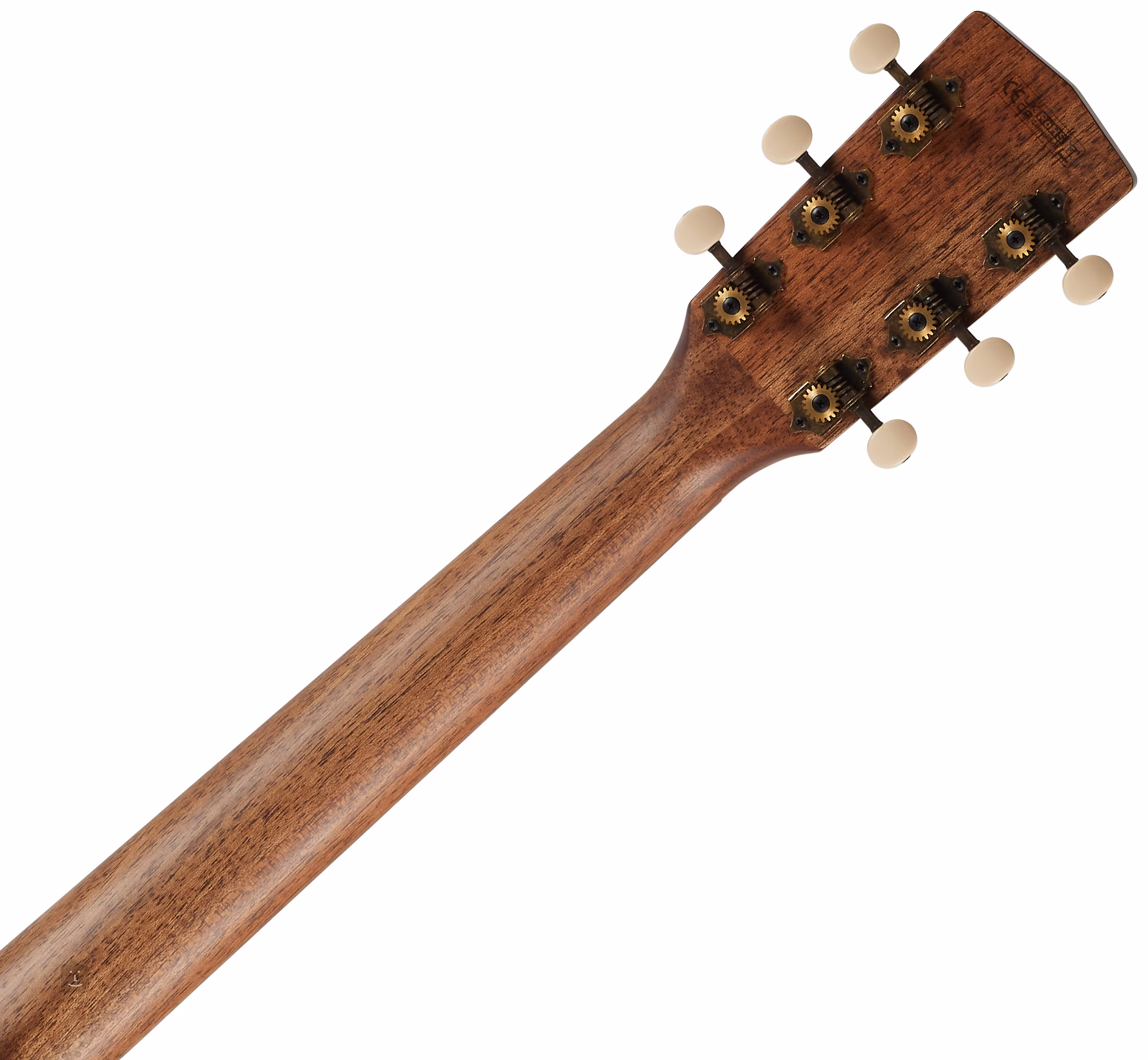 Der Mahagoni-Hals ist auf ein Ovangkol-Griffbrett mit zwanzig Bünden geleimt, und die Positionspunkte erleichtern die Navigation. Die Saiten sind über einen Sattel und ein Griffbrett aus echtem Büffelknochen in einem Ovangkol-Griffbrett verankert und die offene Mechanik im Vintage-Stil mit Wirbeln aus Elfenbein-Imitat. Traditionelle Details wie die ABS-Rosette, die Randeinfassung aus Elfenbeinimitat und das Schlagbrett aus Schildpattimitat, das auch den Lack des Instruments vor Kratzern schützt, runden das Erscheinungsbild des Instruments ab.