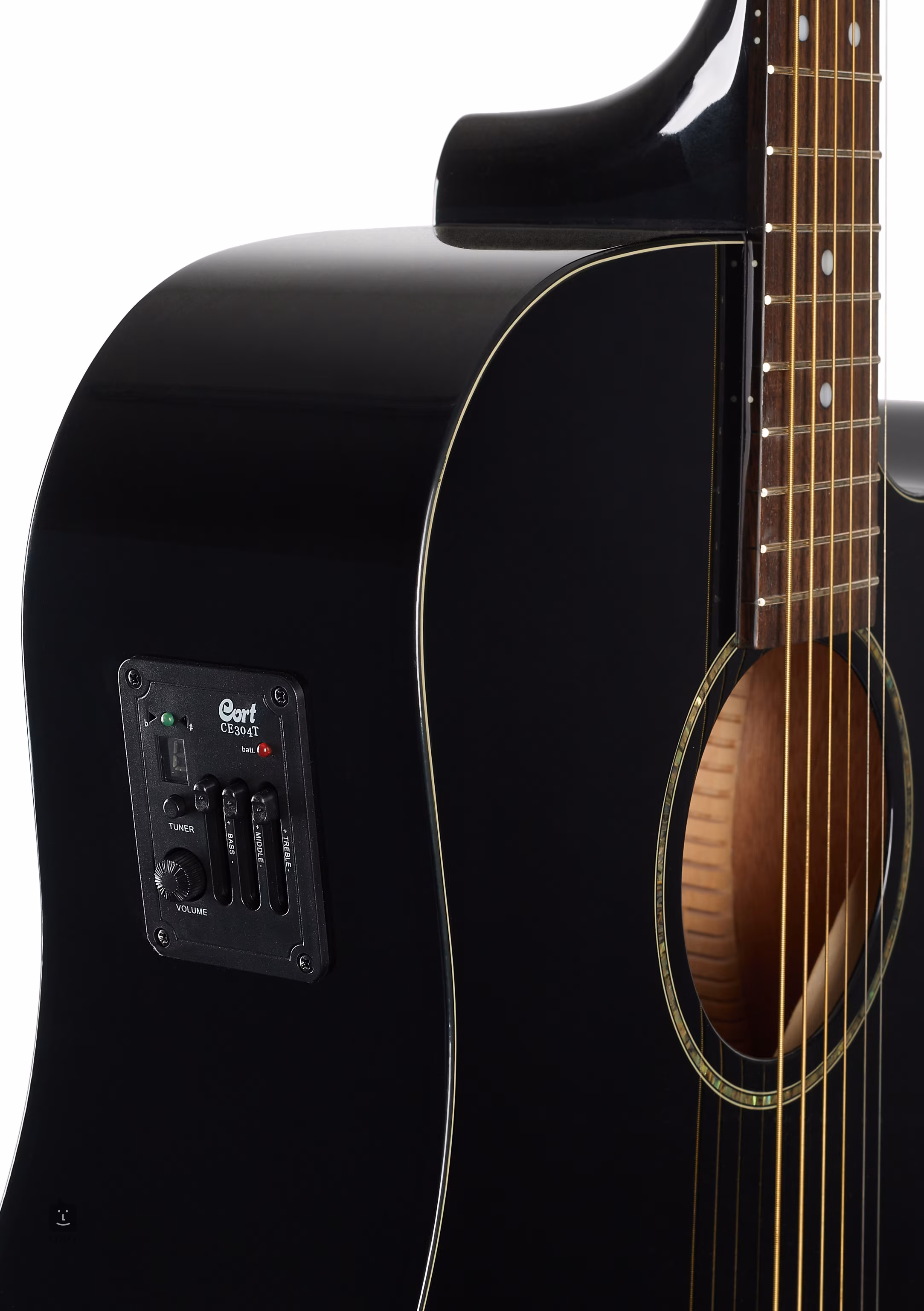 Für die Tonabnahme sorgt ein Cort CE304T Vorverstärker mit Dreiband-EQ und eingebautem Stimmgerät. Die Saiten sind in den hauseigenen Druckguss-Stimmmechaniken und dem Feigenholz-Griffbrett gelagert. Das stilvolle Finish wird durch traditionelle Elemente in Form einer Perlrosette (Abalone) und schwarzem Body Binding akzentuiert.