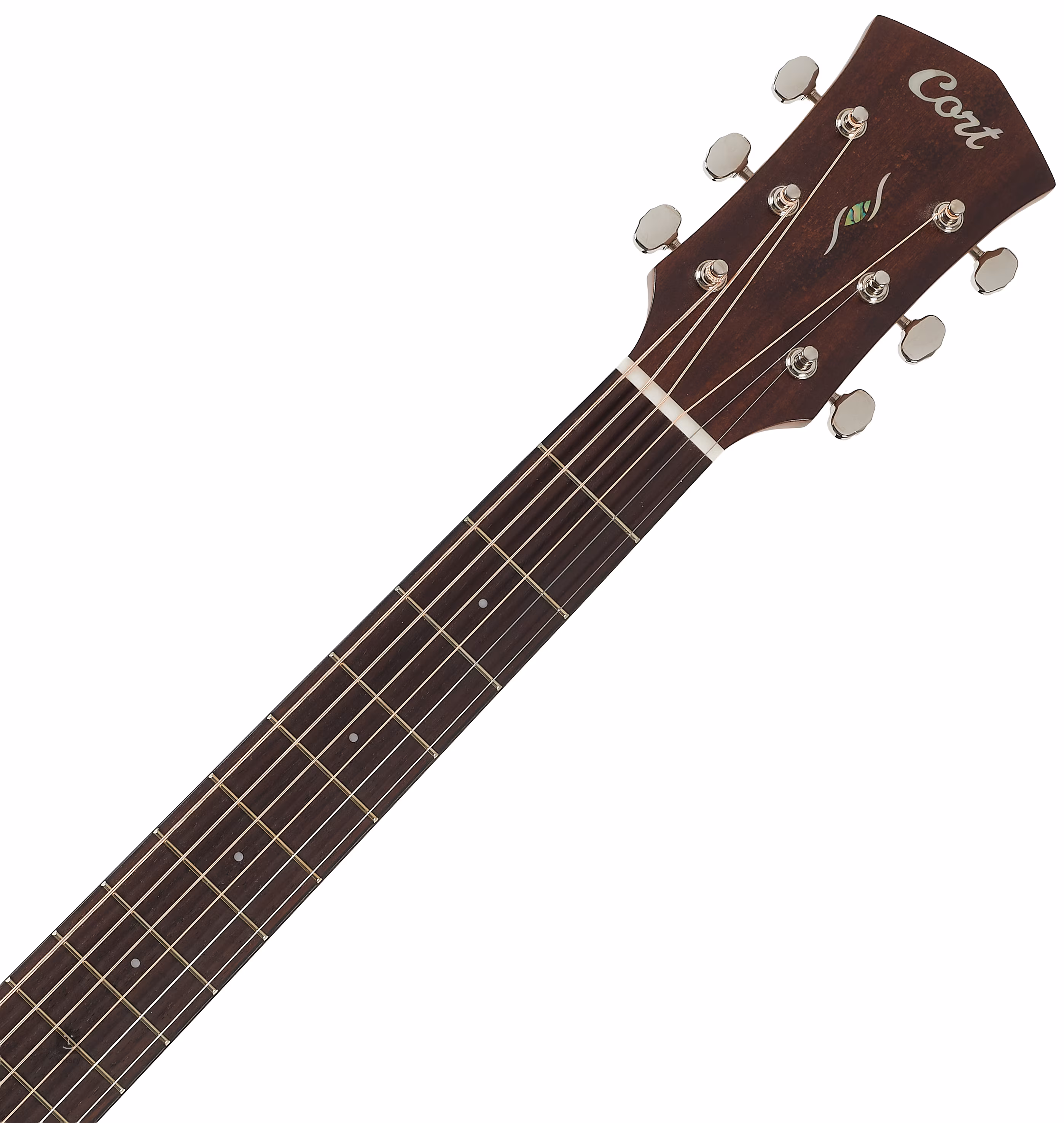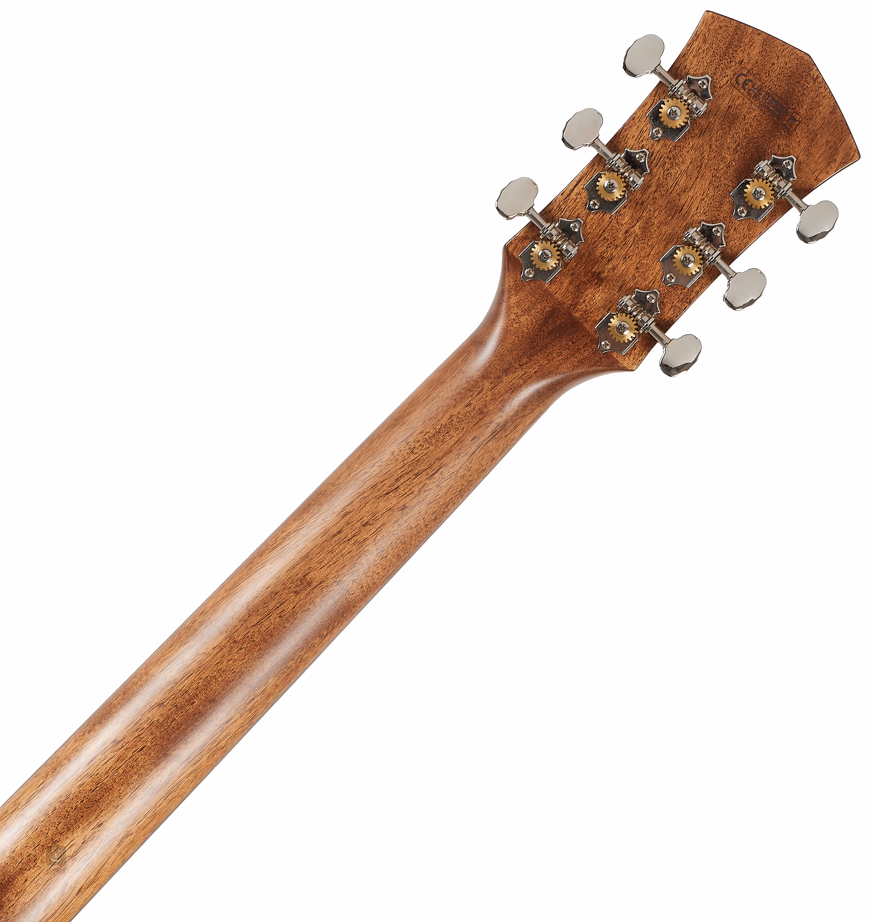 Ein Palisander-Griffbrett mit zwanzig Bünden ist auf einen Mahagoni-Hals mit einem komfortablen C-Profil geleimt. Die Orientierung am Griffbrett wird durch Positionspunkte erleichtert. Die Saiten sind im firmeneigenen offenen Antrieb und Palisandergriffbrett über einem Griffbrett und Sattel aus echtem Knochen montiert. Das stilvolle Finish wird durch die Einfassung aus Elfenbeinimitat und die Fischgrät-Rosette und -Resonanzdecke unterstrichen.