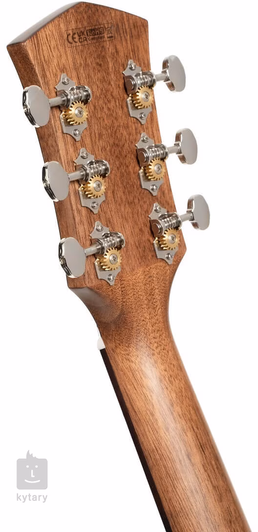 Der Mahagonihals mit komfortablem C-Profil ist mit einem Palisandergriffbrett mit zwanzig Bünden versehen. Die Orientierung auf dem Griffbrett wird durch Positionspunkte erleichtert. Die Saiten sind über den Null- und Sattelbund aus echtem Knochen in den firmeneigenen offenen Mechaniken und dem Palisandersteg befestigt. Die stilvolle Verarbeitung wird durch die helle Einfassung des Korpus und die Rosette sowie die Einlage der Decke im Fischgrätenmuster (Herringbone) unterstrichen.