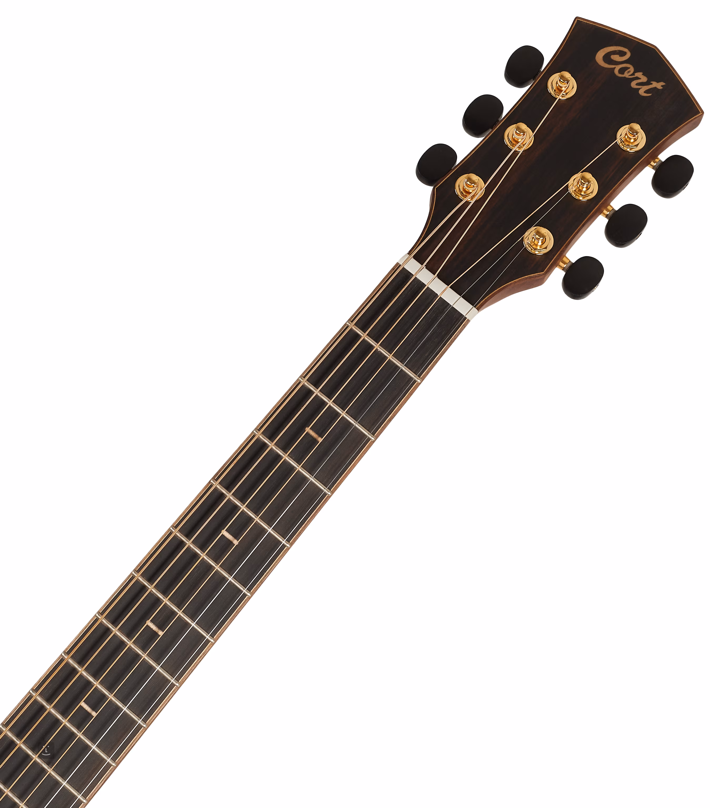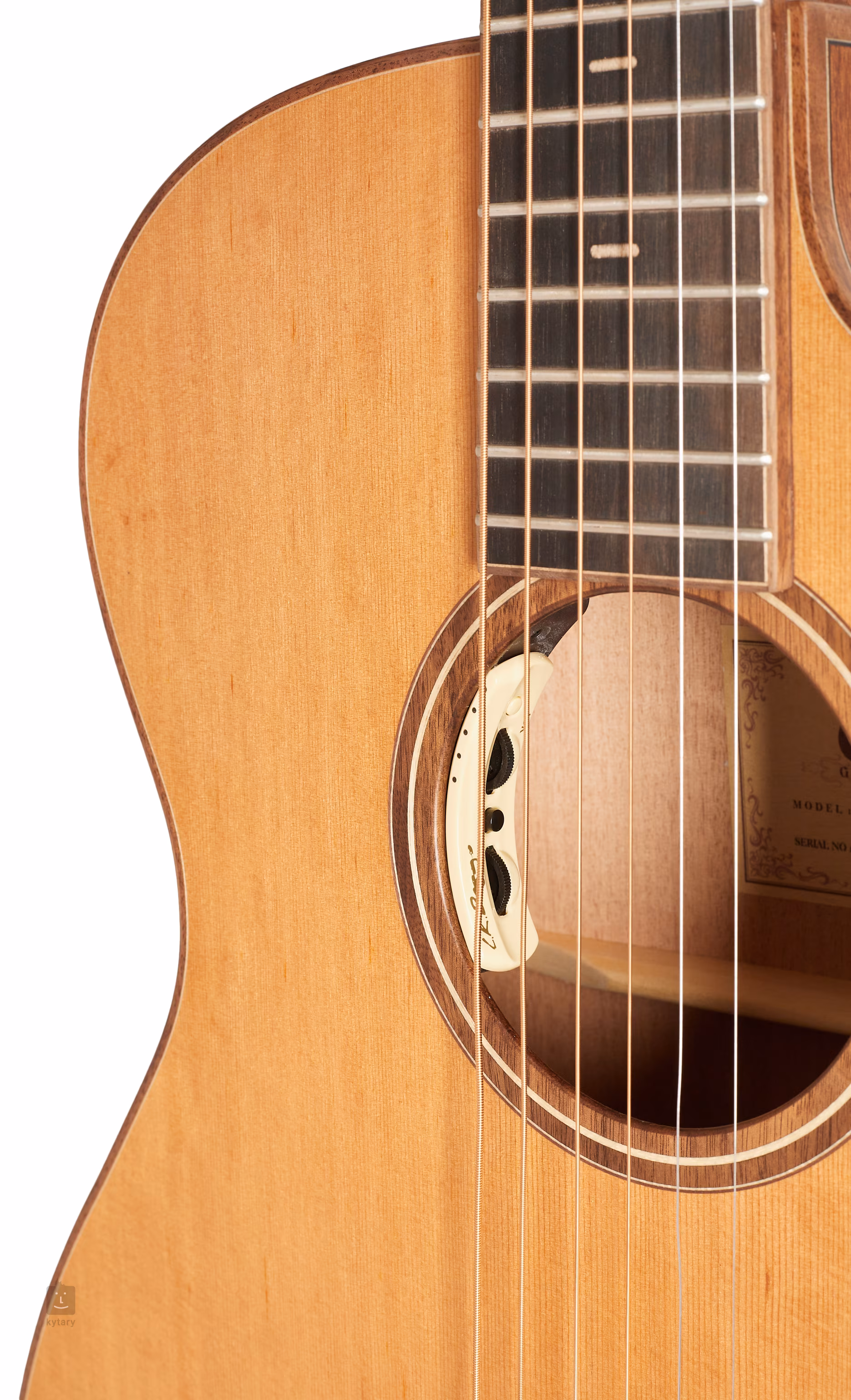 Die Saiten sind in goldfarbenen Druckgussmechaniken mit Ebenholzwirbeln und Ebenholzgriffbrett über den TusQ-Null- und Sattelbünden montiert. Die schöne Verarbeitung wird durch Ahorn-Positionsmarkierungen auf dem Griffbrett, Walnuss-Binding und eine Rosette aus Ahorn- und Walnussringen unterstrichen.