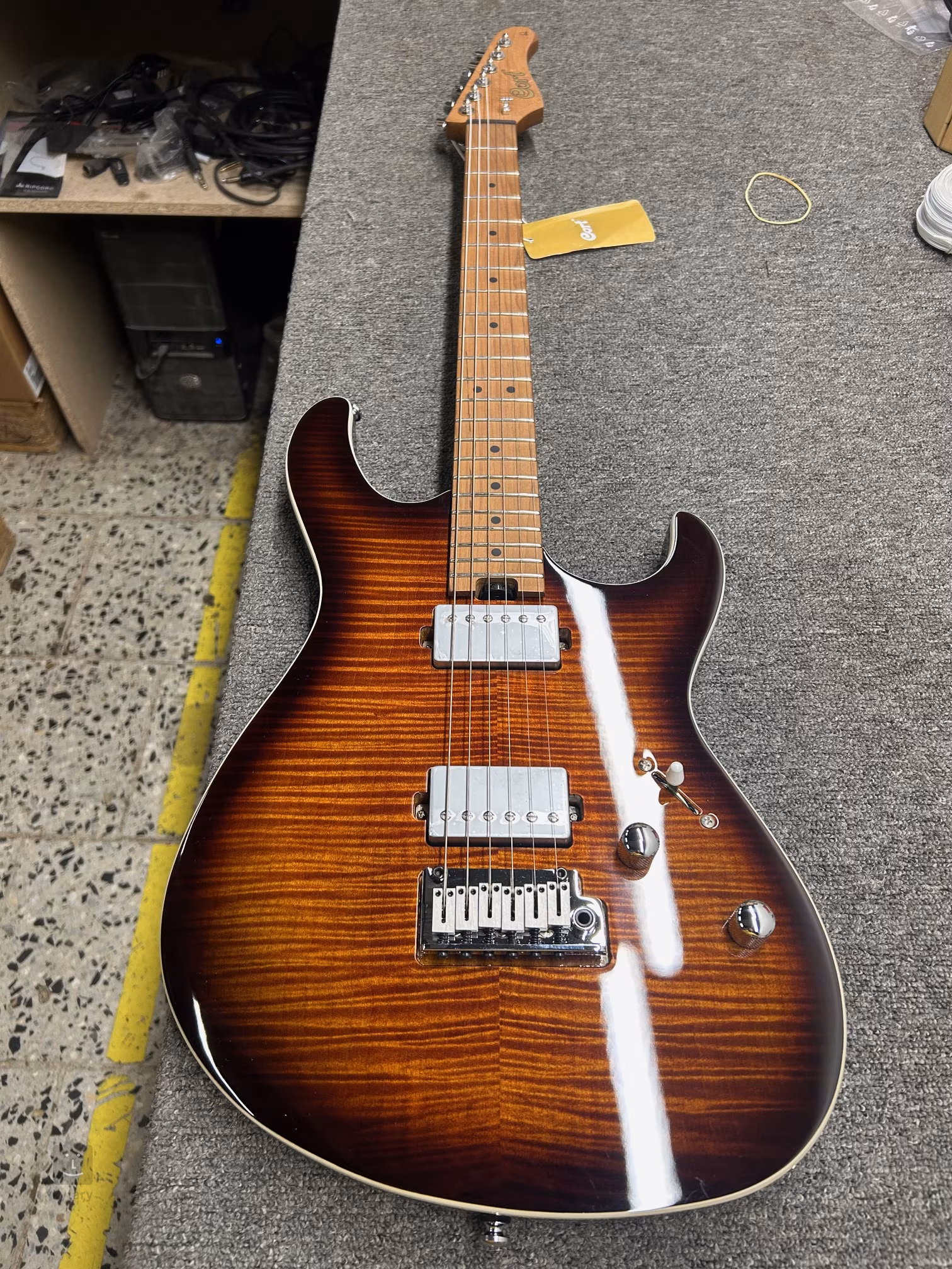 Die Saiten sind in der firmeneigenen Verriegelungsmechanik verankert, die einen schnellen Saitenwechsel ermöglicht, und das firmeneigene Tremolo mit Stahlsätteln.