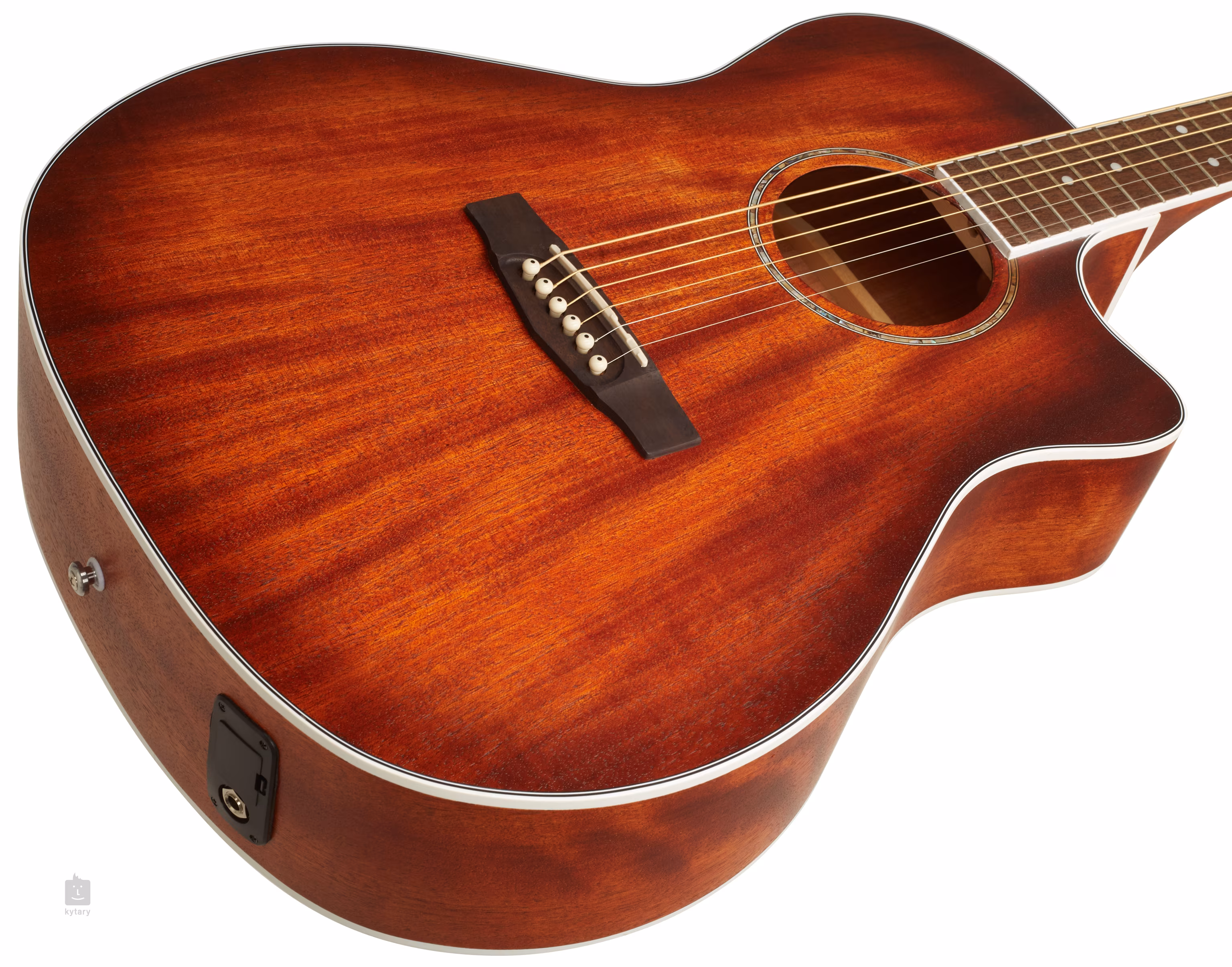 Für die Tonabnahme sorgt der Cort CE306T Vorverstärker mit Vierband-EQ, Lautstärkeregler, eingebautem Stimmgerät und Phase-Taste. Die Saitenlagerung in einem speziell geformten Merbau-Griffbrett und einem verchromten die-cast-Chassis sorgt für gutes Sustain und Stimmstabilität. Die schöne Verarbeitung wird durch die verzierte Rosette aus Perlmuttimitat und die doppelseitige Korpuseinfassung noch unterstrichen.
