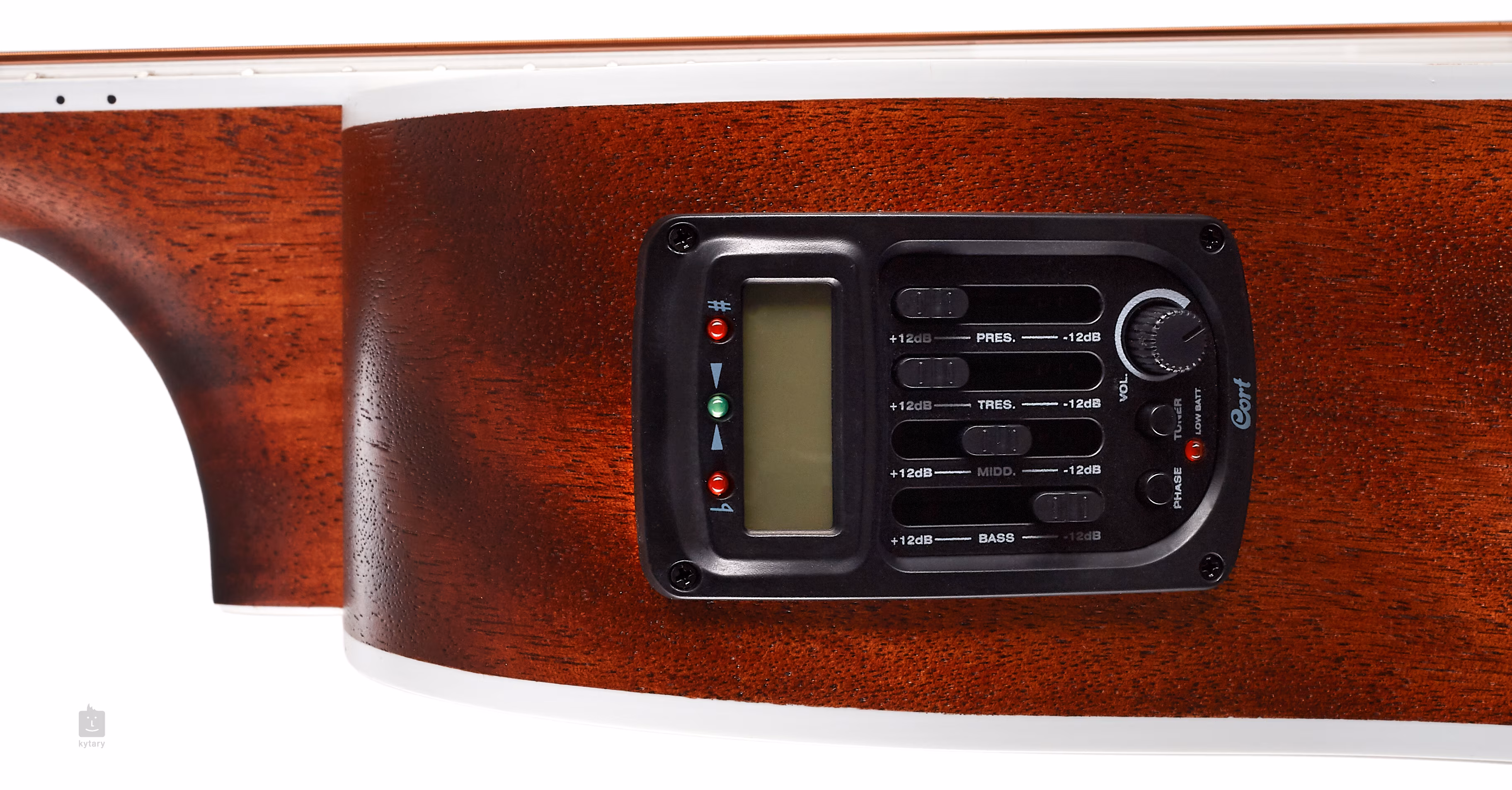 Für die Tonabnahme sorgt der Cort CE306T Vorverstärker mit Vierband-EQ, Lautstärkeregler, eingebautem Stimmgerät und Phase-Taste.