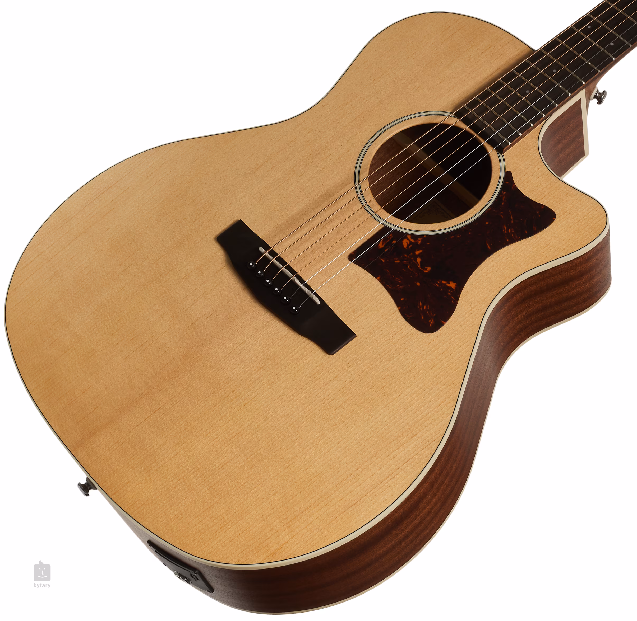 Für die Tonabnahme sorgt ein Cort CE304T Vorverstärker mit Dreiband-EQ und eingebautem Stimmgerät. Die Saiten sind in der hauseigenen Druckgussmechanik und der Ovangkol-Kopfplatte gelagert. Das stilvolle Finish wird durch eine elfenbeinfarbene Rosette und Randeinfassung sowie ein Schildpatt-Schlagbrett akzentuiert.