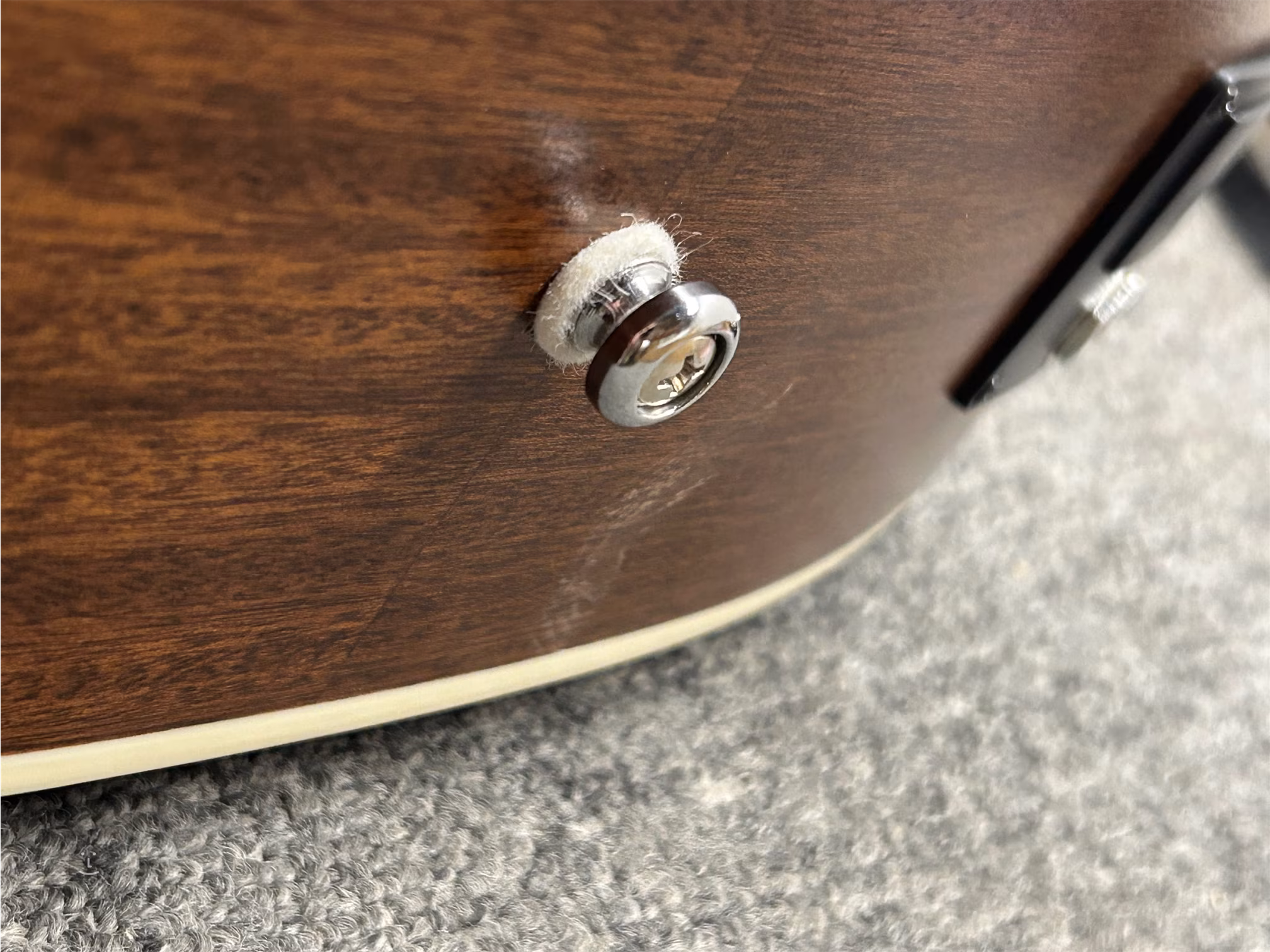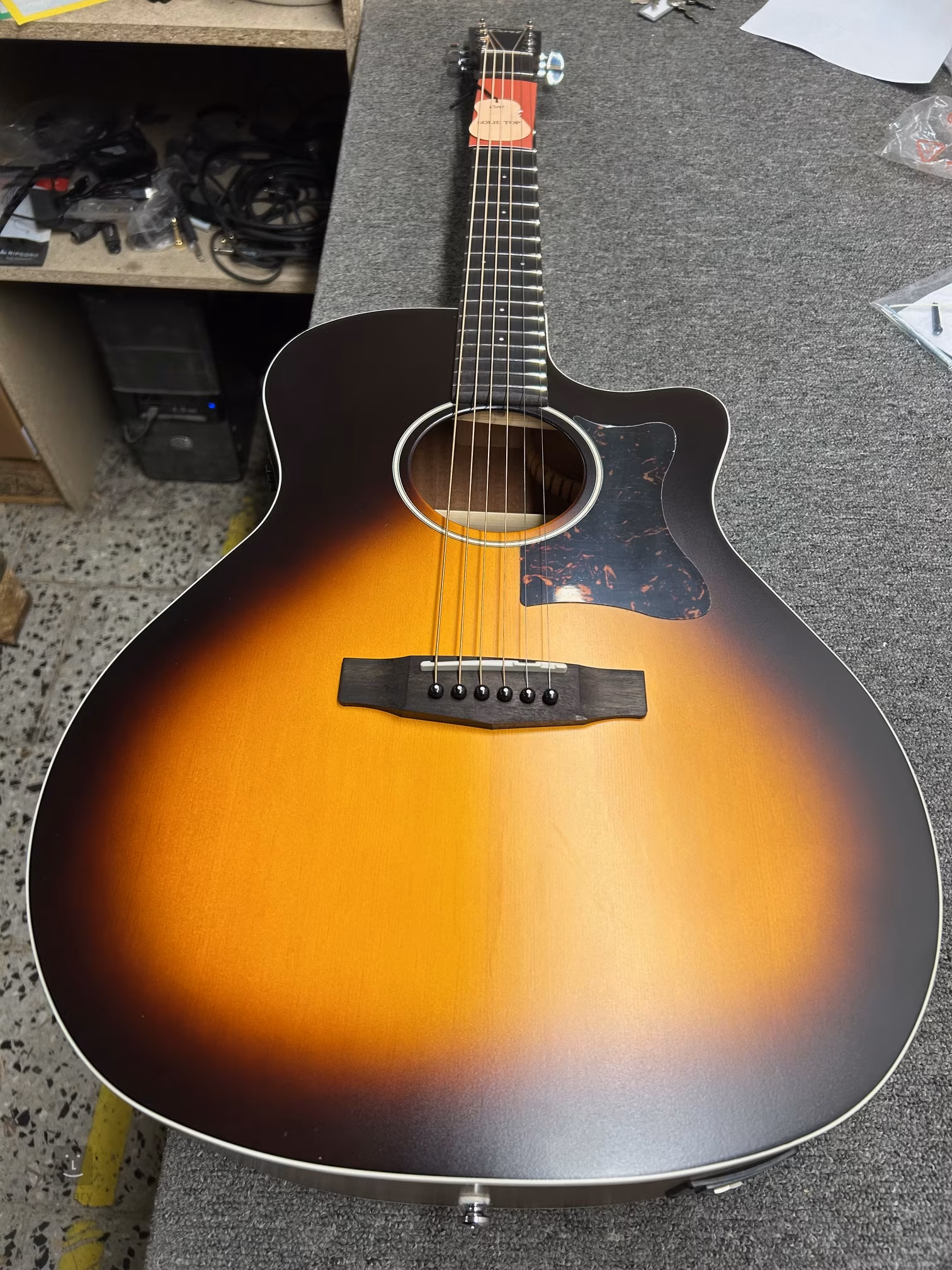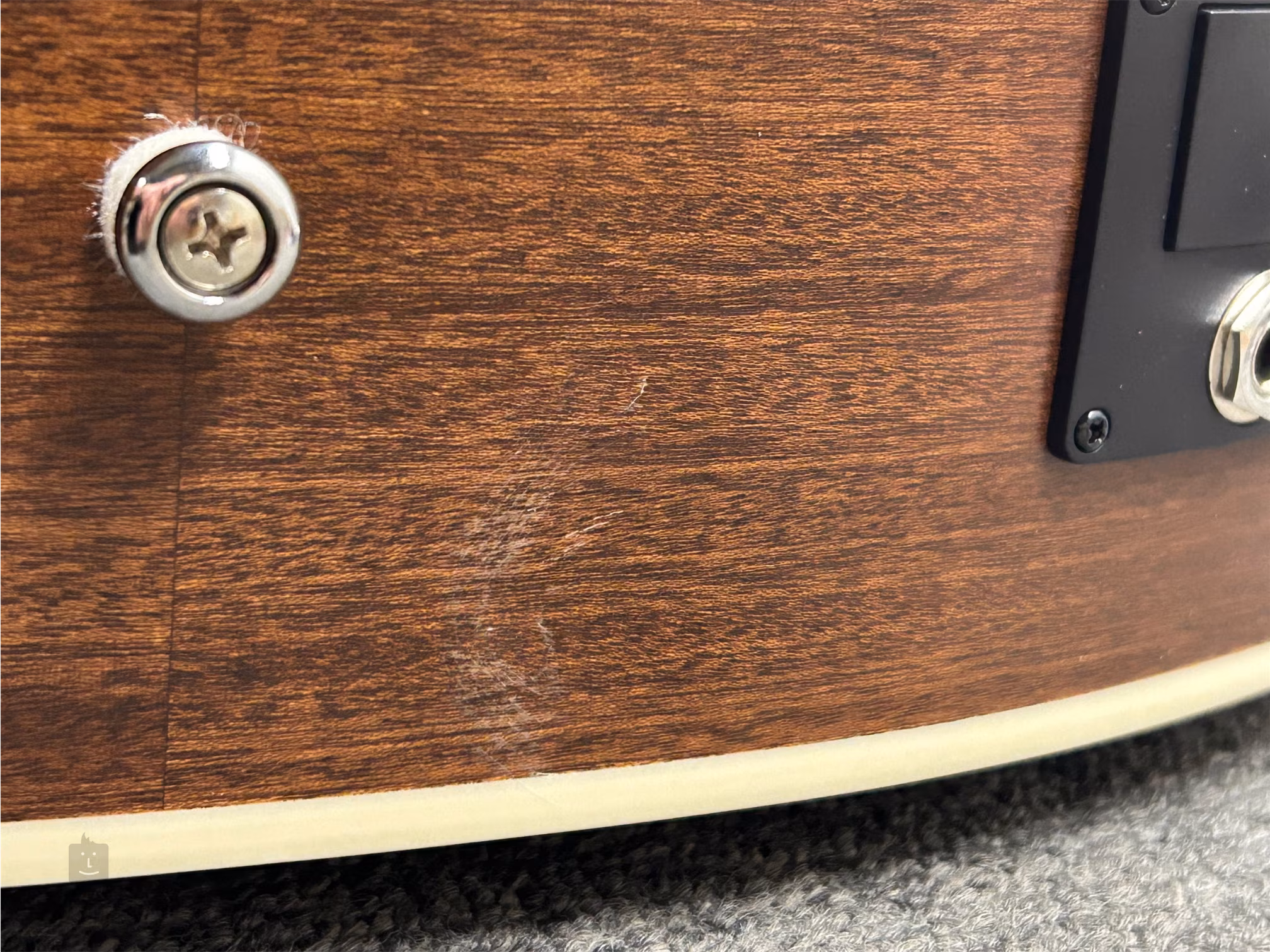 Die Vorderseite der Cort GA1E OPSB ist aus massiver Fichte gefertigt, während Boden und Zargen aus laminiertem Mahagoni bestehen. Der Mahagoni-Hals ist auf ein 20-Bund-Ovangkol-Griffbrett geleimt, das mit weißen Positionspunkten versehen ist, um die Orientierung auf dem Griffbrett zu erleichtern. Der untere Cutaway des Korpus bietet eine gute Anpassung auch an höhere Griffbrettpositionen.