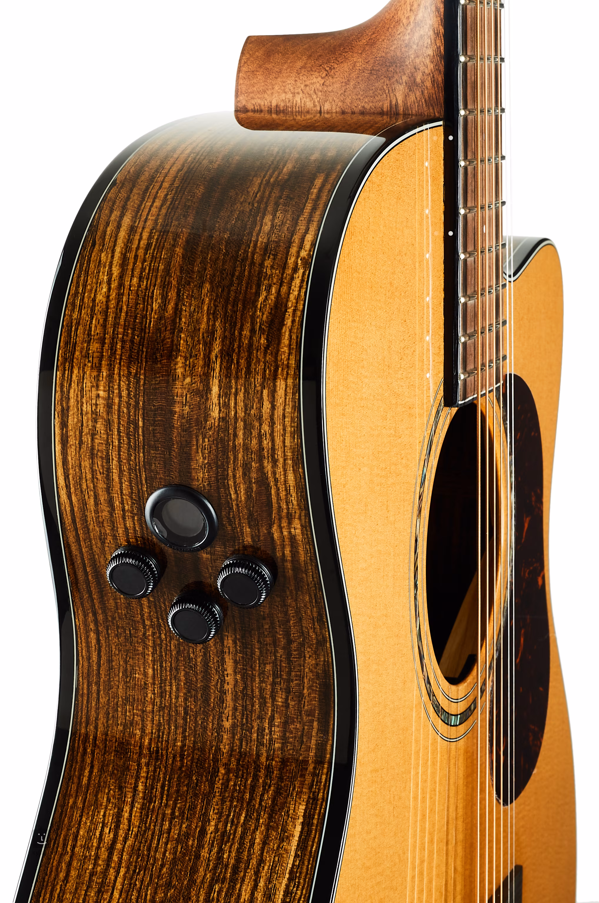 Der Mahagoni-Hals ist mit einem Griffbrett aus Makassar-Ebenholz mit zwanzig handgerollten Bünden verleimt, die dank der Positionspunkte und der dekorativen Einlage am zwölften Bund leicht zu finden sind. Die Stabilität des Halses und der gesamten Konstruktion des Instruments wird durch die Halsverstrebung aus Walnussholz und die DoubleLock-Verbindung zum Korpus erhöht, die zusammen mit einer dünnen Schicht UV-Lack die natürliche akustische Resonanz des Holzes fördert.