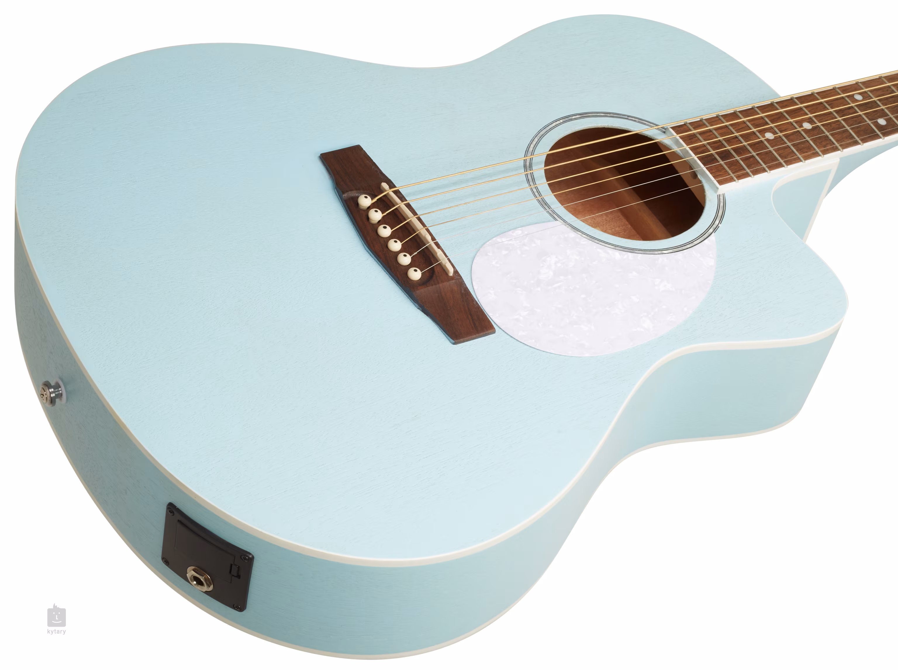 Der Mahagonikorpus dieser Gitarre ist mit einem Open-Pore-Finish und einer himmelblauen Farbgebung versehen. Der Mahagonihals ist mit einem 20-Bund-Feigengriffbrett ausgestattet. Eine tiefe untere Korpusaussparung erleichtert die Anpassung an die höheren Griffbrettpositionen.