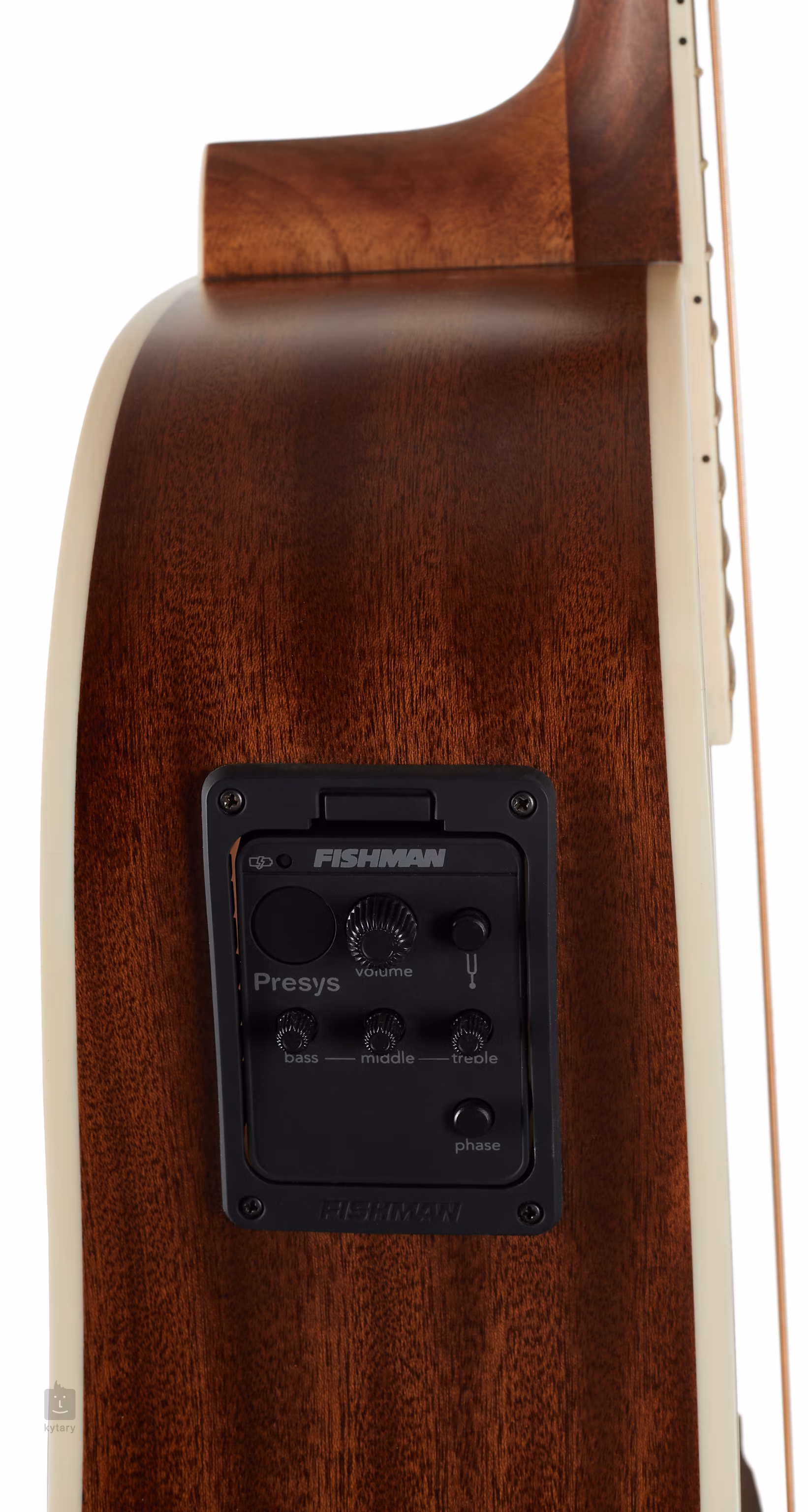 Das Instrument wird von einem Fishman Sonicore Piezo-Tonabnehmer und einer aktiven Fishman Presys-Elektronik mit Dreiband-Equalizer, Lautstärkeregler, Phasenfunktion und integriertem Stimmgerät beschallt.