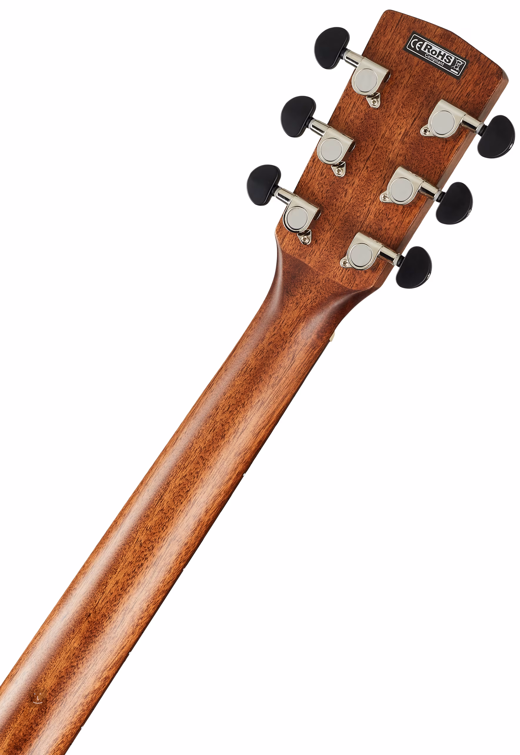 Der Mahagoni-Hals ist mit einem 20-Bund-Ovangkol-Griffbrett verleimt, das mit Positionierungspunkten versehen ist, um die Orientierung zu erleichtern. Die Saiten sind in die-cast-Mechaniken mit schwarzen Wirbeln und einem Ovangkol-Griffbrett verankert.