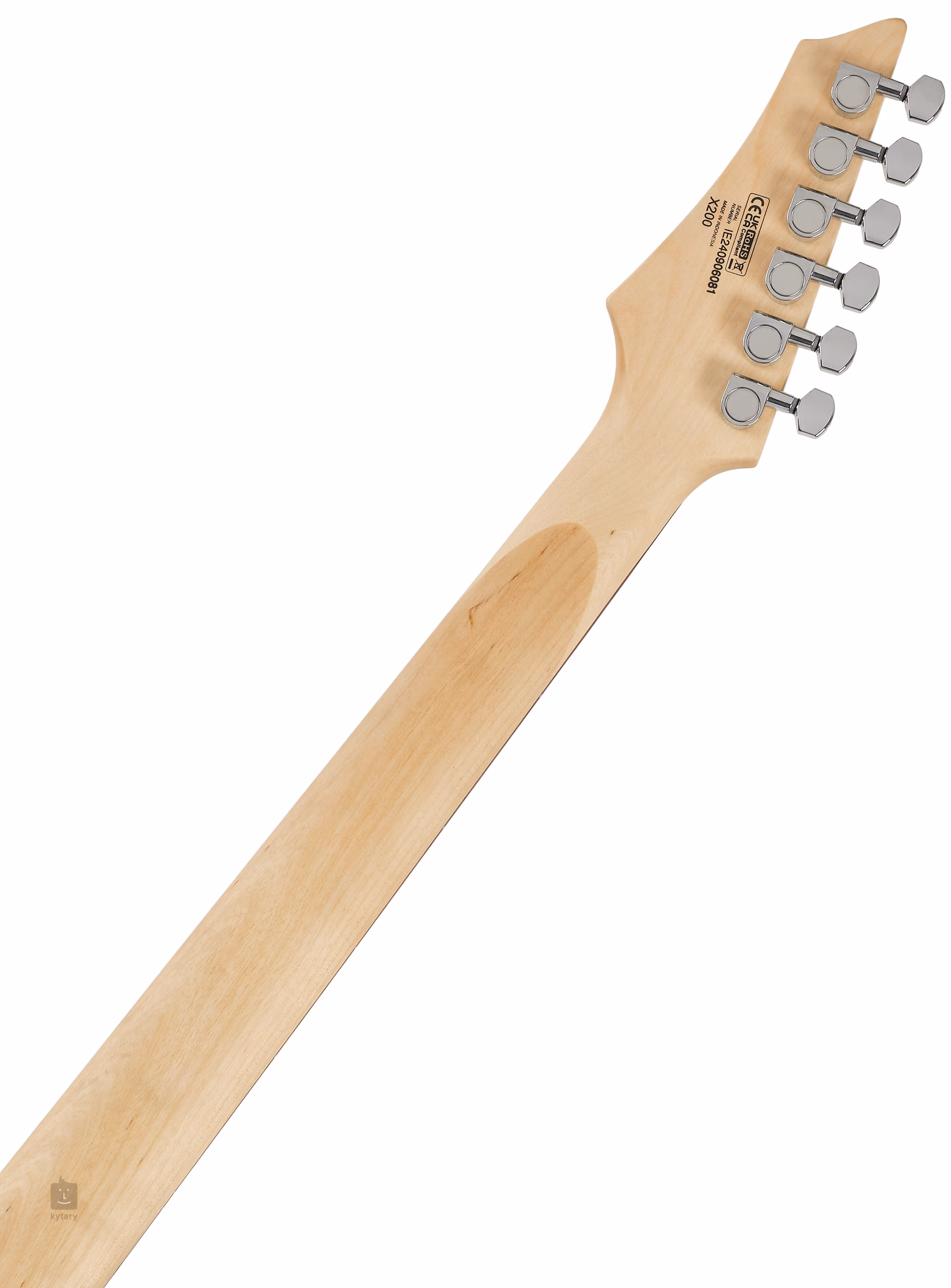 Der Korpus der X200 BK E-Gitarre ist aus Pappelholz gefertigt. Ein Jatoba-Griffbrett mit vierundzwanzig Bünden ist auf einen verschraubten Ahornhals geklebt. Positionspunkte auf dem Griffbrett erleichtern die Orientierung.