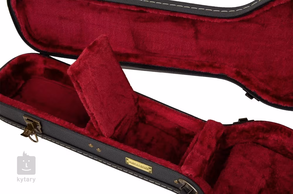 Das Innere des Koffers ist mit weichem Plüsch gefüttert und reichlich gepolstert, so dass die Gitarre sicher vor Stößen und Kratzern geschützt ist. Ein großes Innenfach dient zur Aufbewahrung von Zubehör, in dem Stimmgerät, Saiten, Kapodaster und andere wichtige Utensilien sicher verstaut sind. Der weiche Seitengriff erleichtert das Tragen des Koffers, da er gut in der Hand liegt. Das luxuriöse Design des Koffers wird durch elegante goldene Beschläge akzentuiert und macht ihn nicht nur zu einem praktischen, sondern auch zu einem ästhetischen Accessoire für den sicheren Transport der Gitarre.