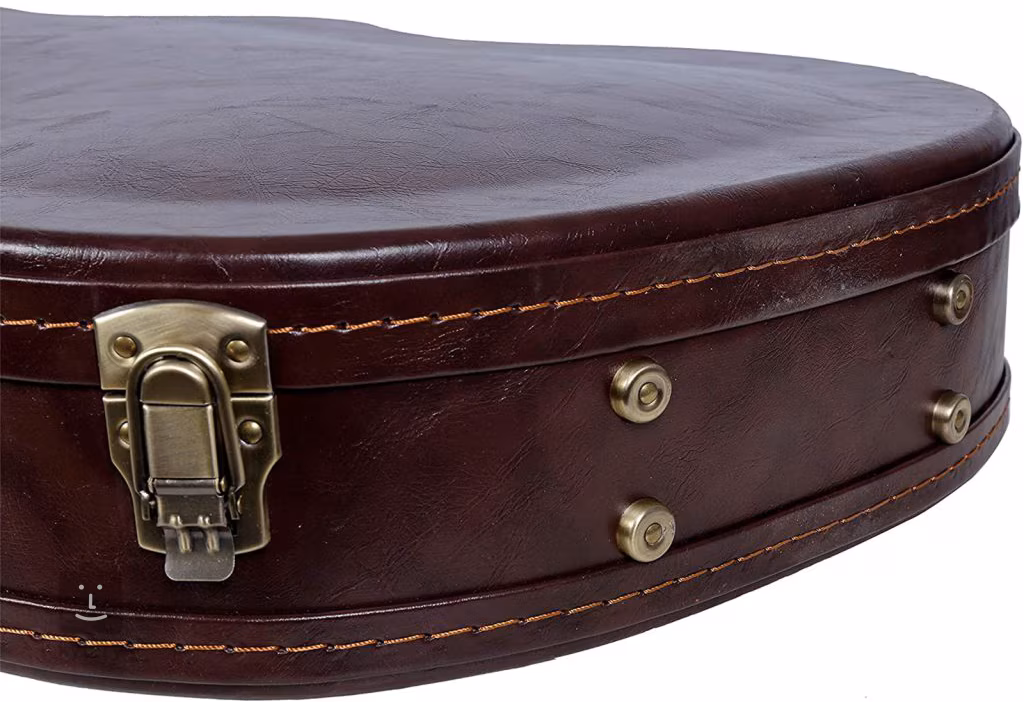 Das Innere des Koffers ist mit weichem Plüsch gefüttert und reichlich gepolstert, so dass die Gitarre perfekt vor Stößen und Kratzern geschützt ist. Ein großes Innenfach dient zur Aufbewahrung von Zubehör, in dem Stimmgerät, Saiten, Kapodaster und andere wichtige Utensilien sicher verstaut werden können. Der weiche, mit Leder überzogene Griff ist leicht zu tragen und liegt gut in der Hand. Das luxuriöse Design des Koffers wird durch elegante Bronzebeschläge akzentuiert und macht ihn nicht nur zu einem praktischen, sondern auch zu einem ästhetischen Accessoire für den sicheren Transport der Gitarre.