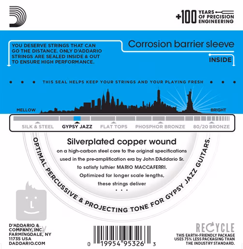 Die Saiten der D'AddarioGypsy Jazz-Serie sind für temperamentvolles Spiel im Stil des berühmten Django Reinhardt gedacht – scharfe Swing-Rhythmen und schnelle Soli. Versilbertes Kupfer, gewickelt auf einen Kern aus hochkohlenstoffhaltigem Stahl, garantiert einen warmen und sehr prägnanten Klang. Die Saiten haben Kugelenden.