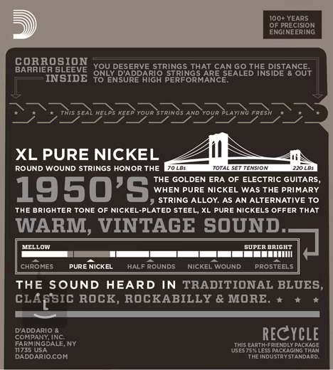 Die D'addario XL Pure Nickel E-Gitarrensaiten versetzen Sie zurück in die 50er Jahre, als Saiten aus reinem Nickel der Goldstandard waren. Sie basieren auf einem sechseckigen Stahlkern, der für perfekte Intonation, lange Lebensdauer und ein gleichmäßiges Spielgefühl sorgt. Die umwickelten Saiten sind mit reinem Nickel drahtumwickelt, was einen satten und gleichzeitig klaren Klang erzeugt, den Sie vielleicht aus frühen Blues-, Rock'n'Roll- und Country-Aufnahmen oder aus der Rock-Ära der 50er und 60er Jahre kennen. Ideal für alle Liebhaber von Vintage-Klängen.