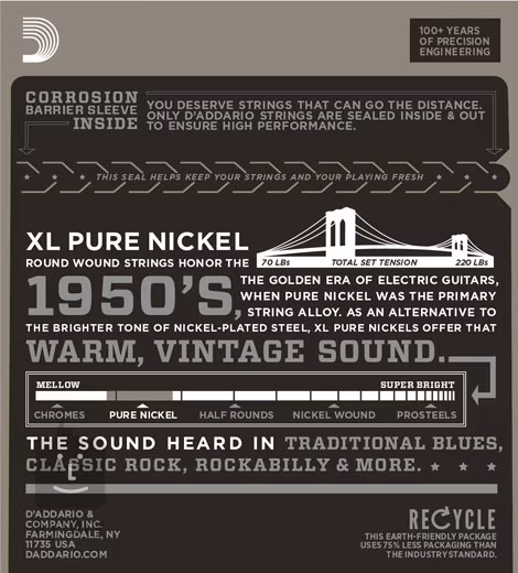 Die D'addario XL Pure Nickel E-Gitarrensaiten versetzen Sie zurück in die 50er Jahre, als Saiten aus reinem Nickel der Goldstandard waren. Sie basieren auf einem sechseckigen Stahlkern, der für perfekte Intonation, lange Lebensdauer und ein gleichmäßiges Spielgefühl sorgt. Die umwickelten Saiten sind mit reinem Nickel drahtumsponnen, was einen satten und gleichzeitig klaren Klang erzeugt, den Sie vielleicht aus frühen Blues-, Rock'n'Roll- und Country-Aufnahmen oder aus der Rock-Ära der 50er und 60er Jahre kennen. Ideal für alle Liebhaber von Vintage-Sounds. In dieser Packung finden Sie einen Satz mit einer umwickelten G-Saite.