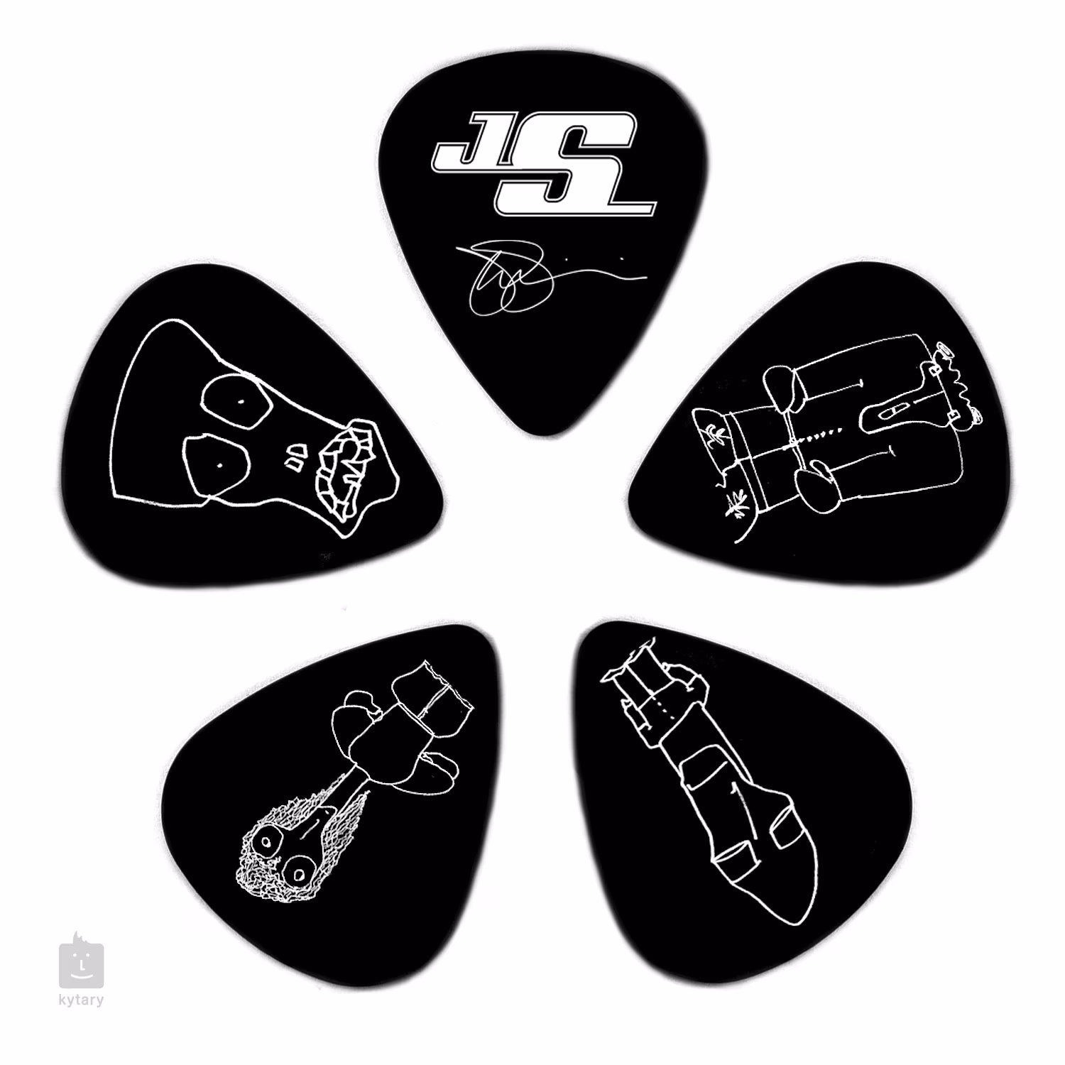 Ein Set schwarzer Zelluloid-Plektren mit handgezeichneten Motiven des Gitarrenzauberers Joe Satriani. Die Packung enthält zehn Plektren, jedes mit einem einzigartigen Motiv.
