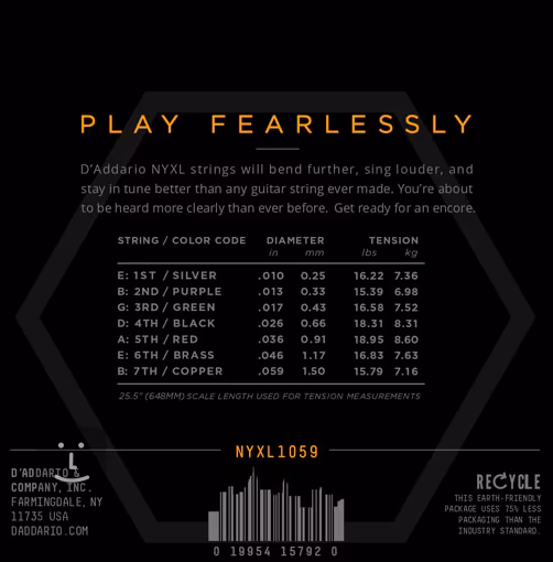 Diese Premium-Saiten für die siebensaitige E-Gitarre D'addario NYXL sind so konzipiert, dass Sie sie bis an die Grenzen ihrer Möglichkeiten biegen können. Gleichzeitig sind sie dank ihrer starken Mittenfrequenzen sehr durchdringend, präzise und klar. Außerdem bieten sie eine außergewöhnlich präzise Stimmstabilität. Ihr sechseckiger Kern besteht aus einer speziellen NY Steel-Stahllegierung, die 40 % widerstandsfähiger ist als herkömmlicher Stahl, sodass Sie sich keine Sorgen über häufiges Reißen machen müssen. Die Wicklung aus vernickeltem Stahl ist außerdem mit der speziellen Fusion Twist-Technologie gewickelt, wodurch die Stimmung um 131 % stabiler ist als bei herkömmlichen Saiten. Es handelt sich also um Saiten von Premium-Qualität, die selbst die anspruchsvollsten Profis begeistern werden.