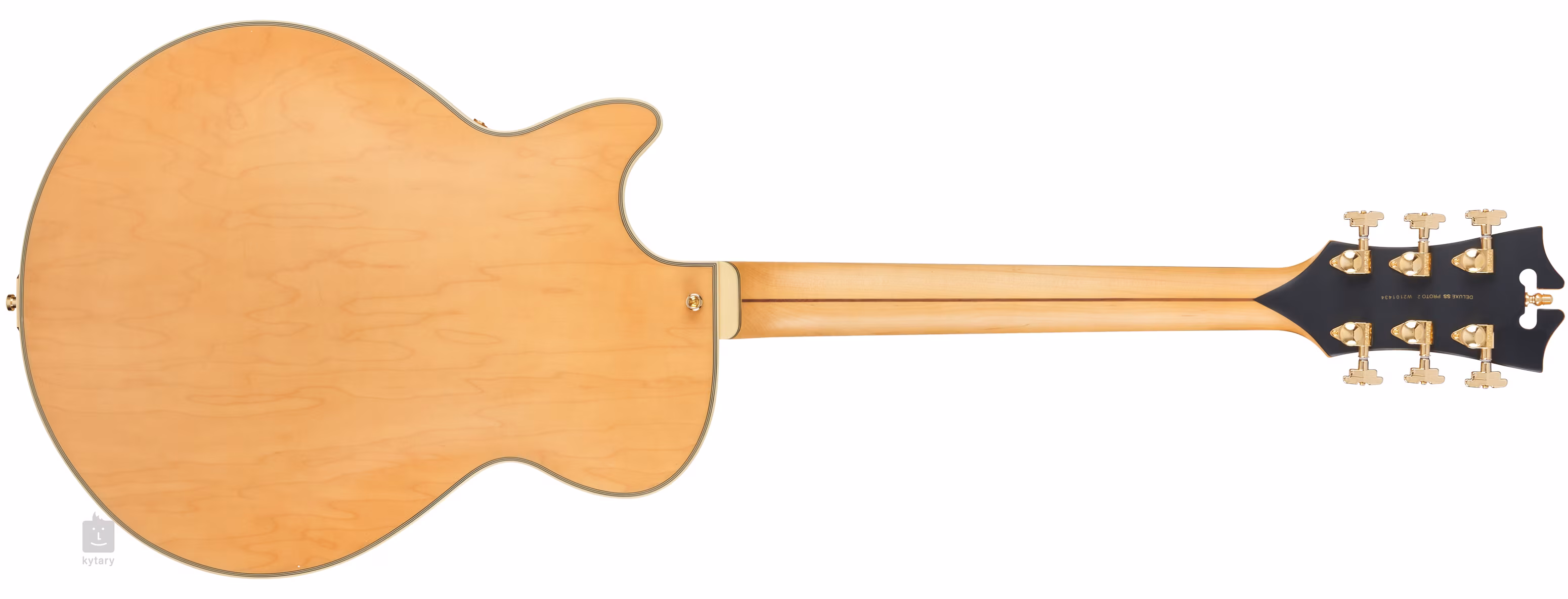 Der Korpus der Gitarre wird durch eine typische Art-Deco-Kopfplatte mit Perlmutt-Logo und -Einlage ausgeglichen. Stabile Stimmung und gutes Sustain werden durch die Befestigung der Saiten durch den Knochen-Nullbund in Grover 509 Super Rotomatic Locking Mechaniken und durch die TOM-Kopfplatte in den Art Deco Style Stringern garantiert. Das luxuriöse Finish der Gitarre wird durch eine satinierte, halbtransparente Lackierung, mehrlagiges Korpus-, Griffbrett- und Kopfplatten-Binding, Scalini Five-Ply Pickguard, Ebenholz-Potentiometerkappen und goldene Hardware akzentuiert.