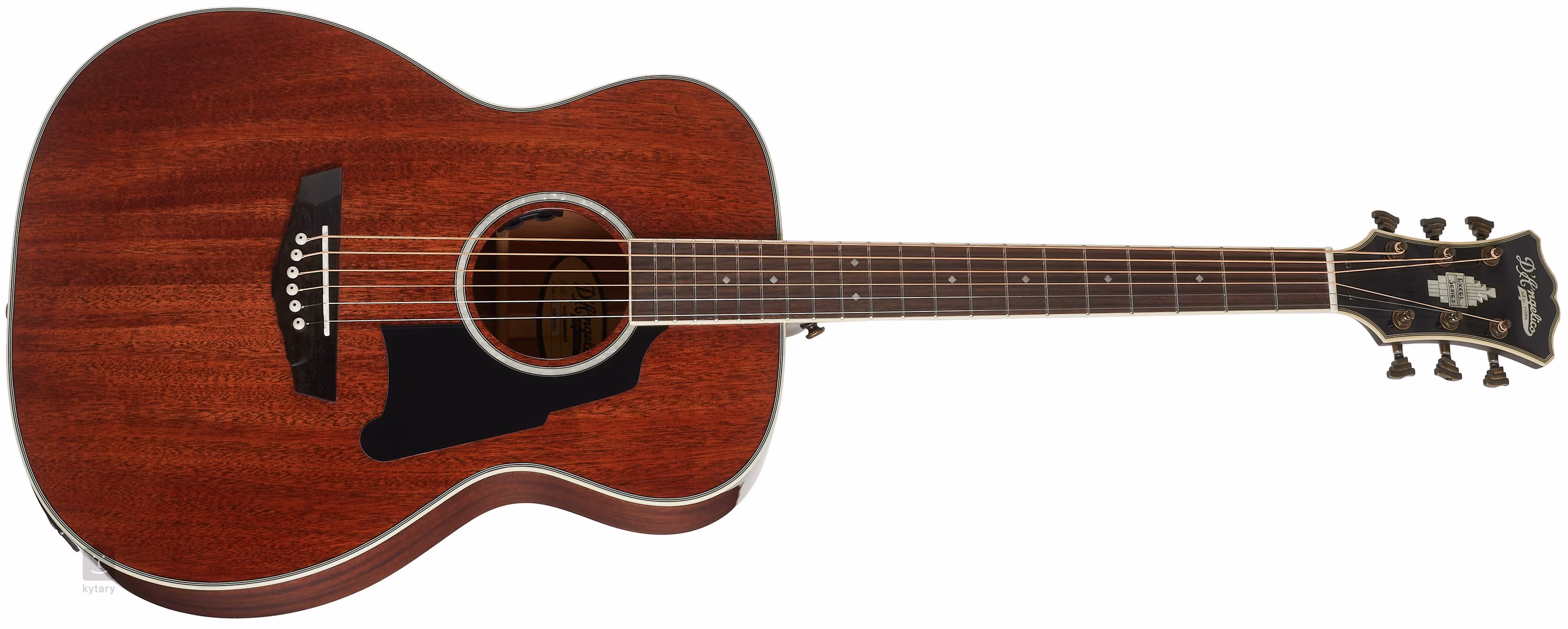 Die Saiten sind über den Sattel und die Null-Knochen-Bünde in eleganten Stairstep-Wave-Stimmmechaniken und einem Palisander-Griffbrett befestigt. Der raffinierte Look des Instruments wird durch eine Rosette aus schwarzen und Perlmuttringen, mehrlagiges Korpus- und Kopfplatten-Binding, Antique Bronze Hardware, Firmenlogo und Excel Series Inlay auf der Kopfplatte, stilvolle Ebenholz-Bracing Cap und schwarzes Scalini Pickguard unterstrichen.