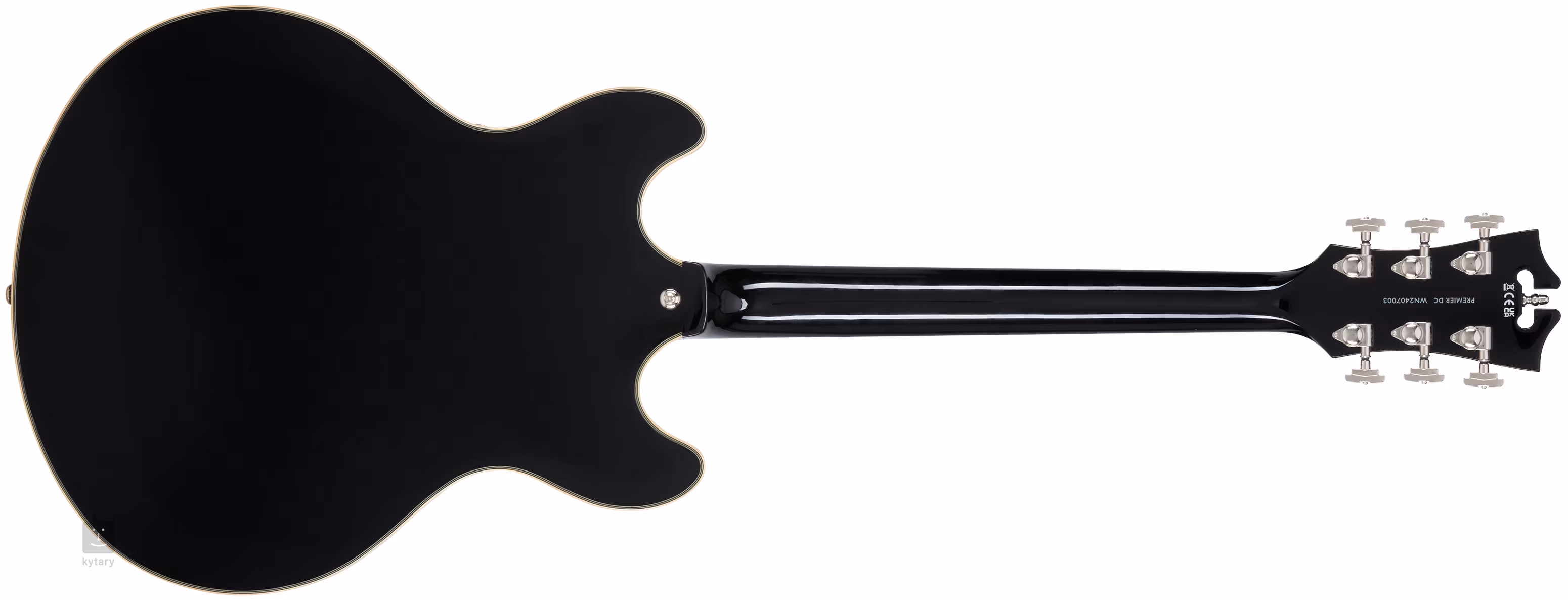 Die Semi-Hollow-Konstruktion der Premier DC Black besteht aus laminiertem Ahorn und einem Mittelblock, der die Decke verstärkt und dem unerwünschten "Binding"-Effekt des Korpus entgegenwirkt. Der Ahornhals ist mit einem Griffbrett aus Walnussholz verleimt, das mit zweiundzwanzig Medium Vintage Neusilber-Pakfong-Bünden ausgestattet ist. Das schmale C-Profil des Halses sorgt für eine reibungslose Bewegung der Finger auf dem Griffbrett und ein komfortables Griffbrett, während die Positionsblöcke aus Perlmuttimitation die Orientierung auf dem Griffbrett erleichtern.