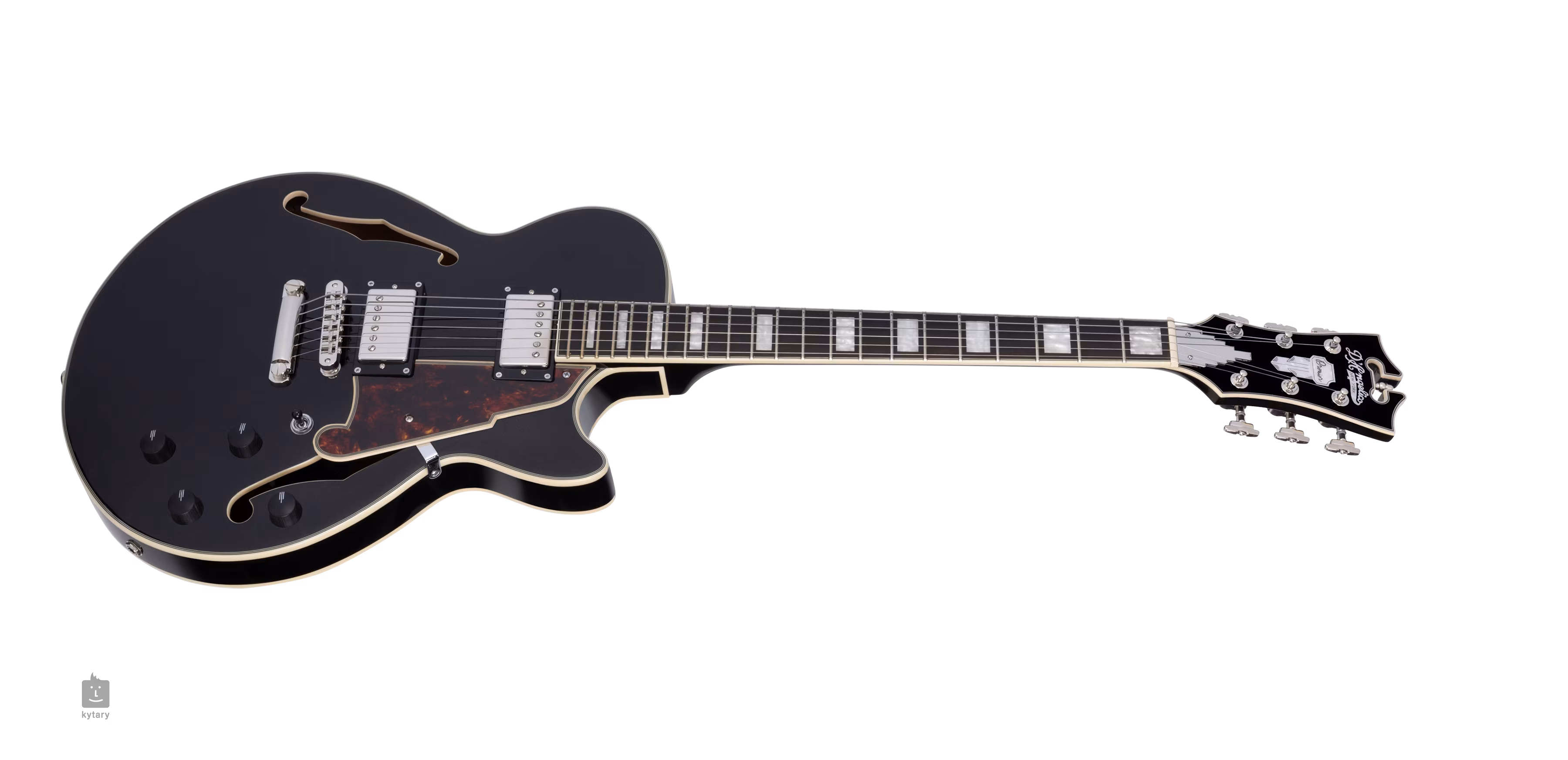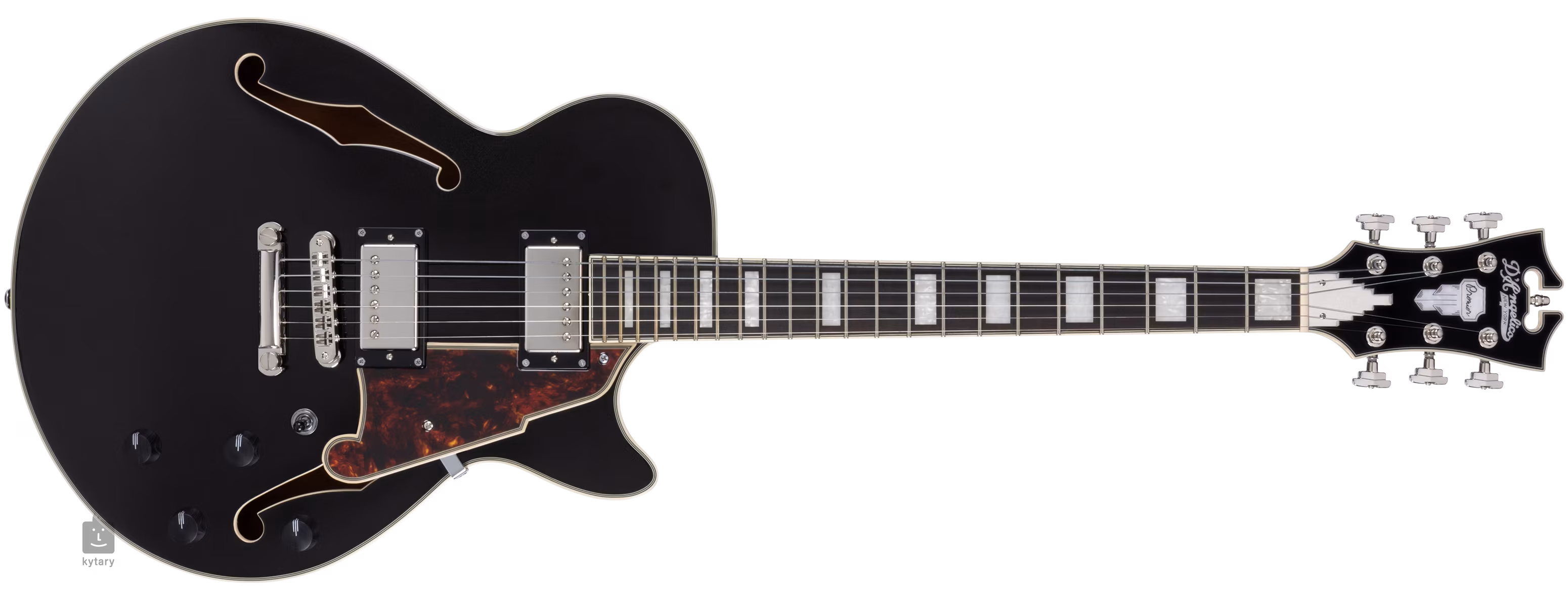 Die Premier-Serie umfasst preisgünstigere Instrumente aus dem Portfolio von D'Angelico, die jedoch alle Anforderungen an die handwerkliche Qualität erfüllen, die mit dieser Marke verbunden sind. Die Premier SS sind Halbakustikgitarren im Single-Cut-Design. Die Halbakustikkonstruktion des Modells PREMIER SS Black Flake besteht aus laminiertem Ahorn. Der Mittelblock verstärkt die Decke und unterdrückt den unerwünschten „Resonanzeffekt” des Korpus. Auf den Ahornhals ist ein Griffbrett aus Pau-Ferro-Holz mit 22 Medium-Vintage-Bünden aufgeklebt. Das schmale C-Profil des Halses garantiert eine flüssige Bewegung der Finger auf dem Griffbrett und einen angenehmen Anschlag, die Orientierung auf dem Griffbrett wird durch Positionsmarkierungen aus Perlmuttimitat erleichtert. Zwei Supro Bolt Bucker A2 Humbucker mit Alnico 2-Magneten, die für den 15 Zoll breiten Halbholz-Korpus optimiert sind, verleihen der Gitarre einen warmen, frischen Klang, der Sie begeistern wird, egal ob Sie einen klaren Ton oder eher rockige Verzerrung/Overdrive bevorzugen. Das Instrument eignet sich somit für Jazz, Blues und Fusion bis hin zu zeitgenössischem Rock. Der Klangcharakter kann mit zwei Lautstärkereglern, zwei Klangreglern und einem dreistufigen Pickup-Schalter gestaltet werden. Der Korpus der Gitarre wird durch den für diese Firma typischen Kopf im Art-Deco-Design mit dem Perlmutt-Firmenlogo und Inlay (Mother-of-Pearl) ergänzt. Eine stabile Stimmung und ein guter Sustain werden durch die Befestigung der Saiten über den Graphtech NuBone XL-Sattel in den Grover 109 Super Rotomatic-Mechaniken und über den TOM-Steg im Saitenhalter gewährleistet. Das stilvolle Aussehen der Gitarre wird durch die Einfassung des Korpus, des Griffbretts und des Kopfes sowie durch das fünfschichtige Scalini-Schlagbrett unterstrichen. Die Gitarre wird in einer Tasche (Gig Bag) geliefert.