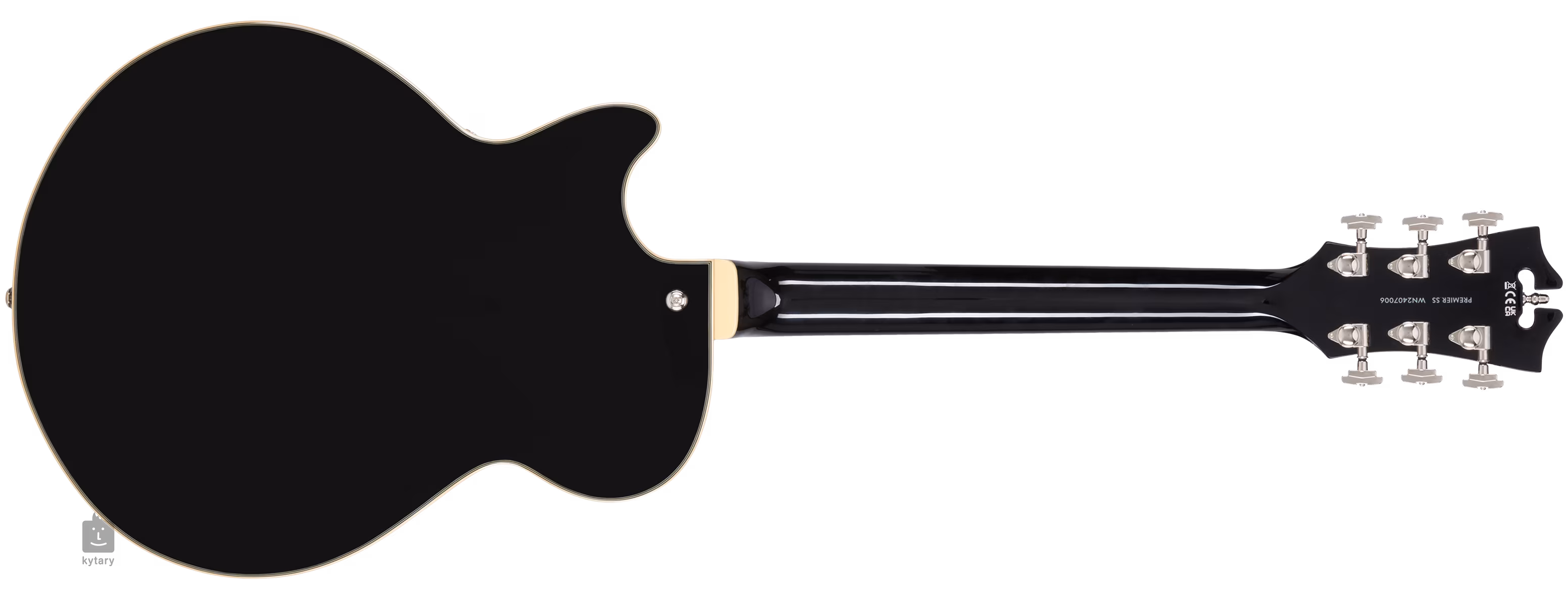 Die Semi-Hollow-Konstruktion des Modells Premier SS Black besteht aus laminiertem Ahorn und einem Mittelblock, der die Decke verstärkt und den unerwünschten "Binding"-Effekt des Balgs unterdrückt. Der Ahornhals ist mit einem Griffbrett aus Walnussholz verleimt, das mit zweiundzwanzig Medium Vintage Neusilber-Pakfong-Bünden ausgestattet ist. Das schmale C-Profil des Halses sorgt für eine reibungslose Bewegung der Finger auf dem Griffbrett und ein komfortables Griffbrett, während die Positionsblöcke aus Perlmuttimitation die Orientierung auf dem Griffbrett erleichtern.