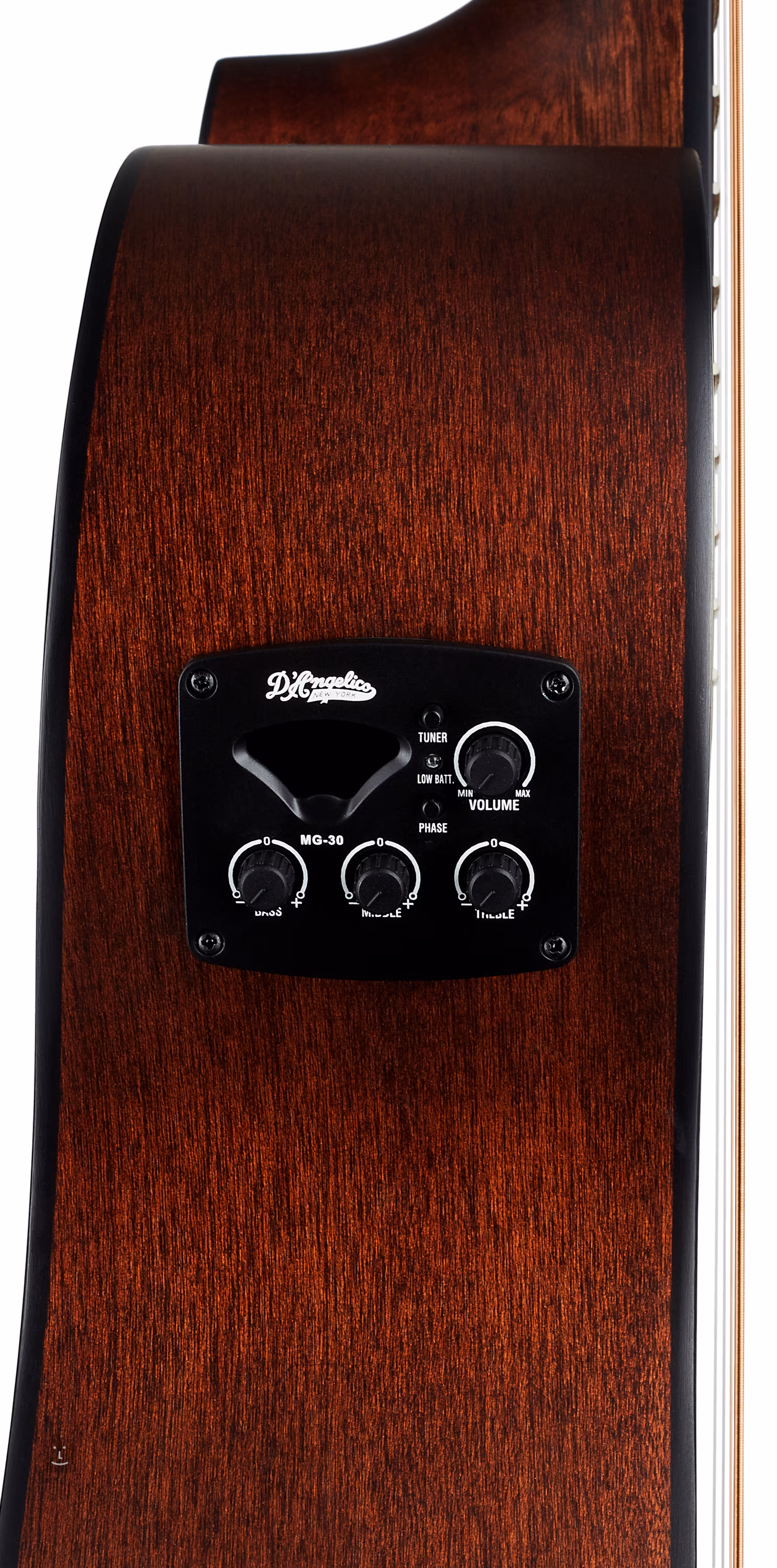 Die D’Angelico Premier Tammany LS ist das Basismodell der elektroakustischen Gitarren aus dem Sortiment der Marke in der kompakteren Orchestra-Form (OM). Der Korpus des Instruments ist aus laminiertem Mahagoni gefertigt. Auf den Mahagonihals mit C-Profil ist ein Griffbrett aus thermisch behandeltem Merbau-Holz (torrefied) mit zwanzig Medium-Jumbo-Bünden aufgeklebt. Die Orientierung auf seiner Oberfläche erleichtern Positionspunkte aus Perlmuttimitat. Die guten akustischen Eigenschaften der Gitarre werden durch eine reduzierte X-Verstrebung (Scalloped X) unterstützt. Der Korpus der Gitarre wird durch einen Kopf in der traditionellen Form der D'Angelico-Instrumente ausgeglichen, der mit dem Firmenlogo aus Perlmuttimitat verziert ist. Die Saiten sind über den Sattel und den Nullbund aus Kunststoff (PPS) in den bereits erwähnten Firmenmechaniken in Chromausführung und dem Steg aus Merbau befestigt. Das Aussehen des Instruments wird durch eine Rosette aus schwarz-weißen Ringen aus ABS und eine schwarz-weiße Einfassung des Korpus aufgelockert. Für die Beschallung des Instruments sorgt ein D'Angelico MG-30 Vorverstärker mit integriertem Stimmgerät, der in den Korpus der Gitarre eingebaut ist.
